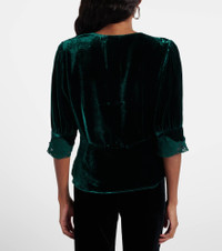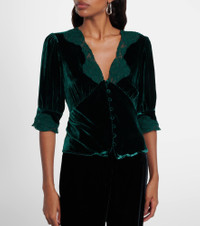 London label Rixo takes classic silhouettes and fuses them with British eccentricism. Made from dark green velvet with lace trims, the Amanda top features mid-length sleeves and tonal button fastenings down its front. Product Details - Material: 81% viscose, 19% silk - Care instructions: dry clean - Made in China - Designer color name: Forest Green Velvet - Item color: green - Trim: 100% polyester - Lace: 81% cotton, 19% polyamide - Closure: concealed zipped side, buttoned front - Item number: P01113064 Size & Fit - True to size - Ideal fit for larger bust sizes - Cinched waist - Non-stretchy fabric - Slightly cropped - The model seen in the picture is 178cm-5'10" and wearing a size XS