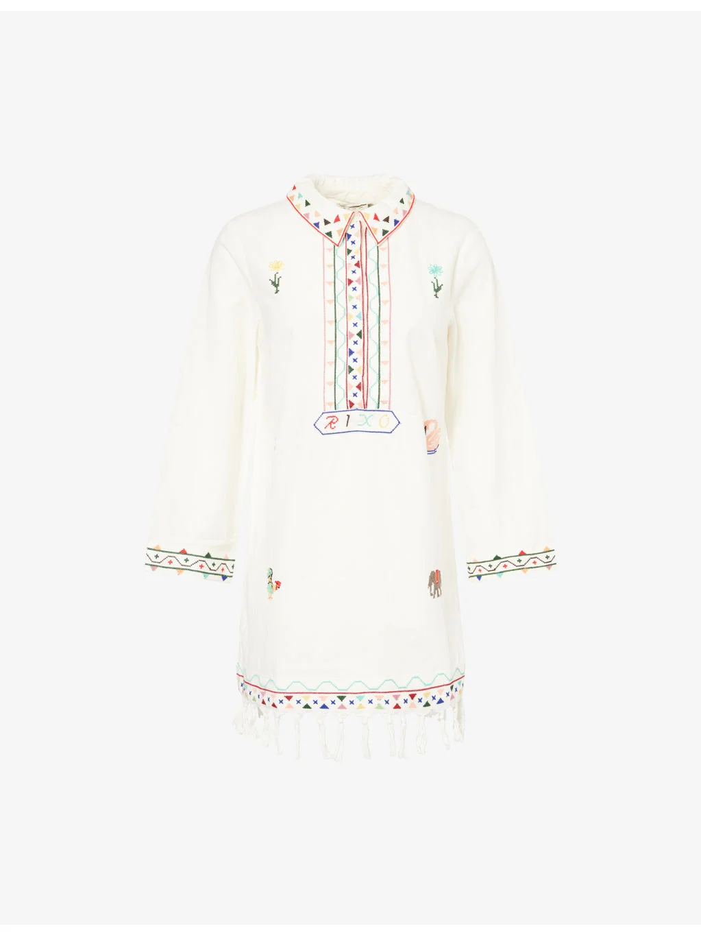 PRODUCT DETAILS - Rixo cotton mini dress - 100% cotton - Concealed button fastenings at front - Relaxed fit, pointed collar, long sleeves, brand embroidery at front, tassel trims at hem, mini length, all-over graphic embroidery - Hand wash - True to size - Size small: length 30.5in / 78cm - Model is 5ft 10in/1.78m and wears a size small - Lightweight, non-stretch Ref: R04560997