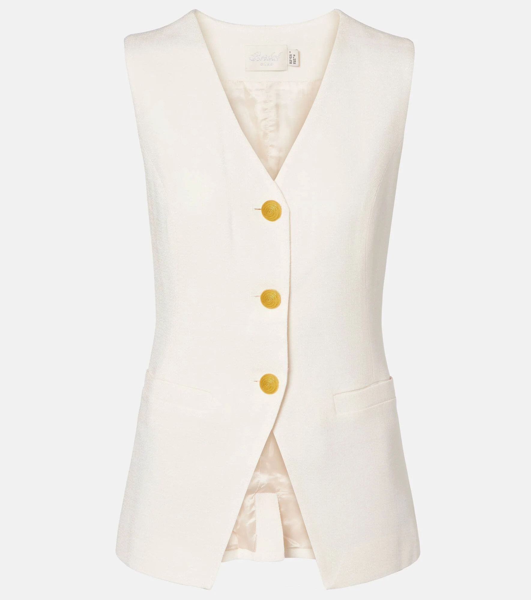 Forget the endless search for hidden gems, Rixo's vintage-inspired designs deliver ample retro charm. The Ingrida vest will make your special day memorable with its sculptural silhouette, flattering V-neckline, and refined gold-toned buttons. Product Details - Material: 83% acetate, 17% polyester - Care instructions: dry clean - Made in China - Designer color name: Pearl - Item color: beige - Lining: 100% viscose - Hardware color: gold - Collar: V-neck - Closure: buttoned front - Pockets: welt pockets - Vent: single - Fully lined - Item number: P01105834 Size & Fit - Fits large to size - we recommend trying one size smaller - Cinched waist - Non-stretchy fabric - Falls below the hip - The model seen in the picture is 178cm-5'10" and wearing a size XXS