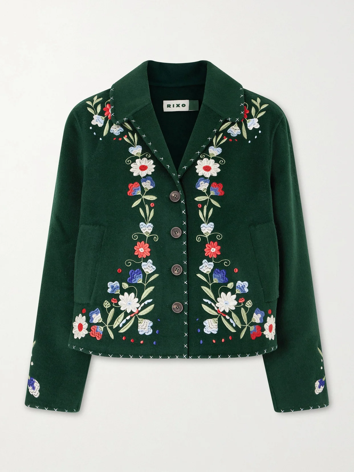 RIXO's 'Jude' jacket evokes the unique charm of '70s bohemia. It's cut from wool-blend felt for a boxy fit and beautifully detailed with whipstitching and vivid floral embroidery.