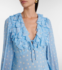 Forget the endless search for hidden gems, Rixo vintage-inspired designs capture the magic of rare finds. Blue polka-dots define the Lasca top: a playful design made from silk with long, frilled sleeves. Product Details - Material: 100% silk - Care instructions: dry clean - Made in China - Designer color name: Light Blue Mini Polka Dots - Item color: blue - Material II: 100% viscose - Closure: zipped side, concealed zipper - Self-tie collar - Cuff: frilled - Hem: elasticated - Item number: P01084147 Size & Fit - True to size - Semi-sheer - Cinched waist - Non-stretchy fabric - Slightly cropped - The model seen in the picture is 178cm-5'10" and wearing a size XS