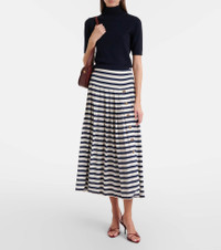 Rixo's vintage-inspired dresses deliver retro charm. The Lea midi skirt features a flowing silhouette with gold and black-toned buttons and an all-over striped pattern. Product Details - Material: 100% viscose - Care instructions: dry clean - Made in China - Color: blue - Designer color name: Lea Stripe Navy - Item color: blue, white - Lining: 100% polyester - Hardware color: gold, black - Closure: concealed zipped side - Item number: P01137249 Size & Fit - Fits large to size - we recommend trying one size smaller - Non-stretchy fabric - The model seen in the picture is 178cm-5'10" and wearing a size XXS