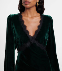 London label Rixo takes classic silhouettes and fuses them with British eccentricism. Made from dark green velvet, the Macie minidress features black lace trims and a concealed zipper fastening on its side. Product Details - Material: 83% viscose, 17% silk - Care instructions: dry clean - Made in China - Designer color name: Forest Green Velvet - Item color: green - Lining: 100% polyester - Collar: V-neck - Closure: concealed zipped side - Item number: P01113061 Size & Fit - Fits large to size - we recommend trying one size smaller - Cinched waist - Non-stretchy fabric - The model seen in the picture is 178cm-5'10" and wearing a size XXS