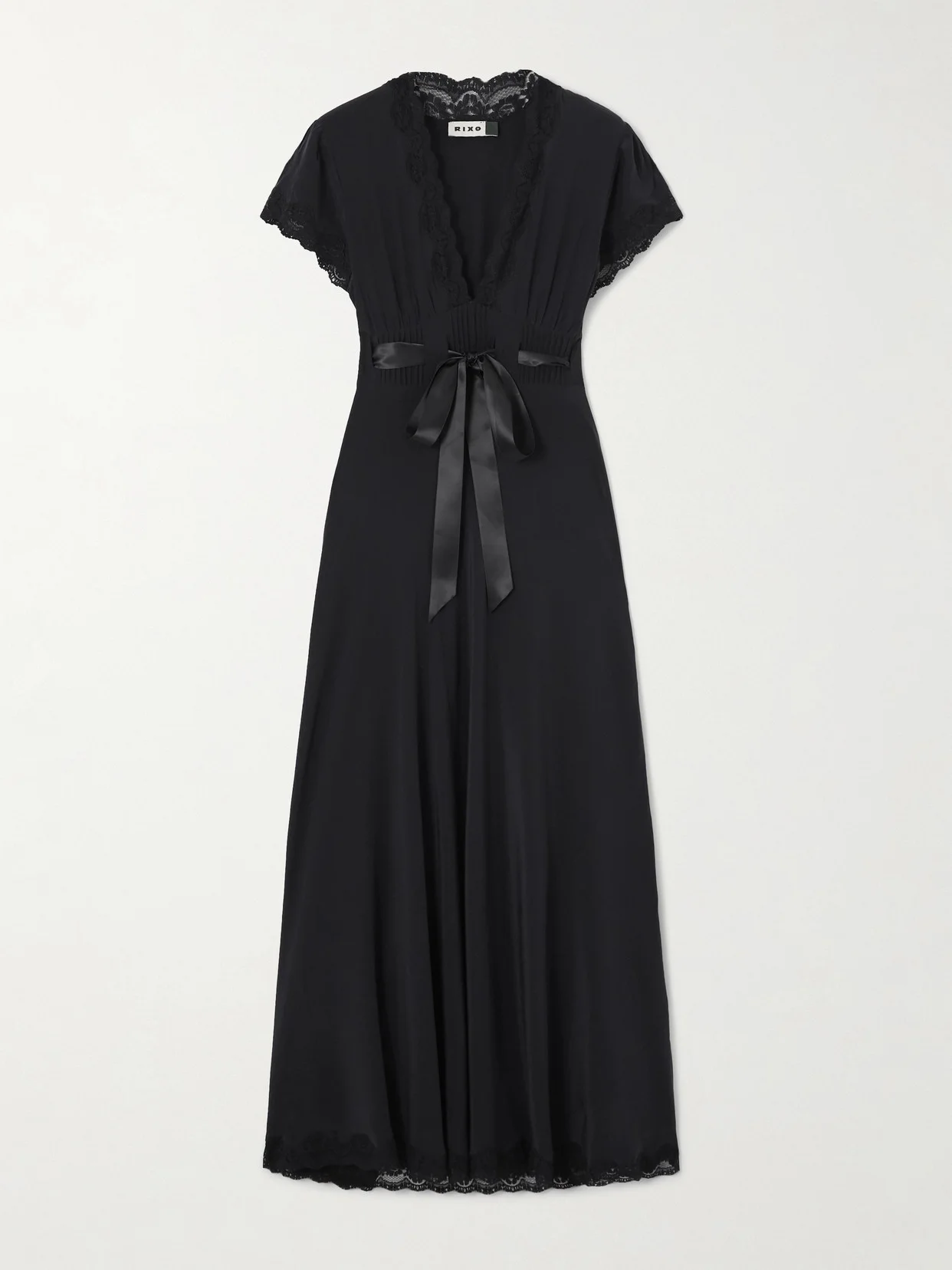 "Vintage is at the heart of our inspiration"; describes RIXO's co-founders Henrietta Rix and Orlagh McCloskey. Cut from fluid silk-chiffon, this 'Marlice' dress is trimmed with delicate lace and has an empire waist that cinches with a self-tie belt. Complement the plunging neckline with a dainty pendant.