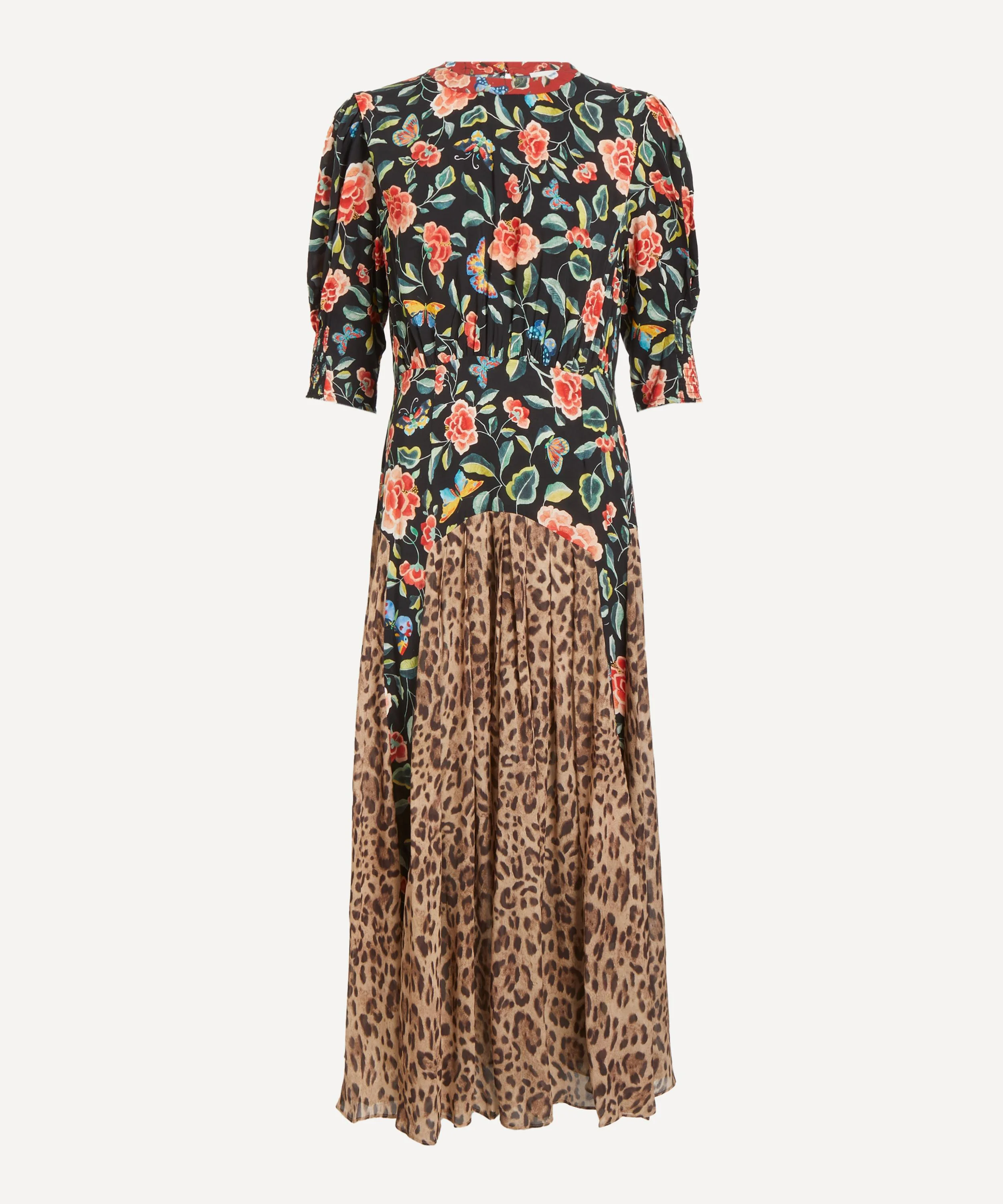 DETAILS Crepe dress Fits true to size Midi length Mid-length sleeves Shirred cuffs Crew neckline Fitted waist Full skirt Button and zip fastening Contrasting leopard and floral prints SIZE & FIT Model is 175cm/5'9"; Chest: 76cm; Waist: 58cm; Hip: 90cm and wears a size 8 COMPOSITION & CARE 100% Viscose Dry clean