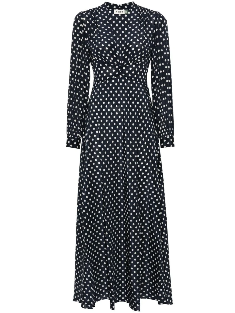 Emory polka dot maxi dress Highlights - Navy blue, white - Silk - Crepe texture - Polka dot print - Bias cut - Plunging v-neck - Long sleeves with buttoned cuffs - Rear curved hem - Unlined - Fabric-covered buttons - Front button and concealed side zip fastening Imported Composition Silk 100% SIZE & FIT Model measurements Height 5 ft 11 in(1.8 m) Bust/Chest 33.07 in(84 cm) Hips 37 in(94 cm) Waist 25.59 in(65 cm) FittingInformation Designed for a close fit at the chest and waist with a loose fit at the hip Made from a midweight non-stretch fabric This piece fits true to size – take your usual size Washing instructions Dry Clean Only