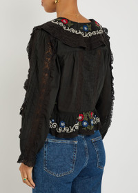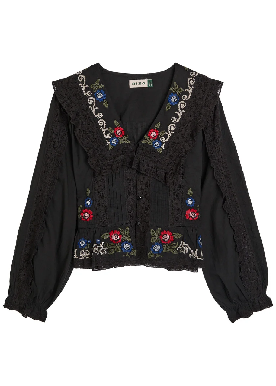Info & Care Rixo cotton;blouse Floral embroidery, floral lace inserts and trims, sailor collar, rounded sleeves, elasticated cuffs, pleated and pintuck details, peplum hem, ruffled trims Button fastenings through front 100% cotton Hand wash; Size & Fit Length shoulder to hem: 18.5 inches/ 47cm Midweight Relaxed fit Model is 5'10"/ 178cm and wears a size;UK8