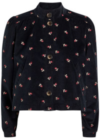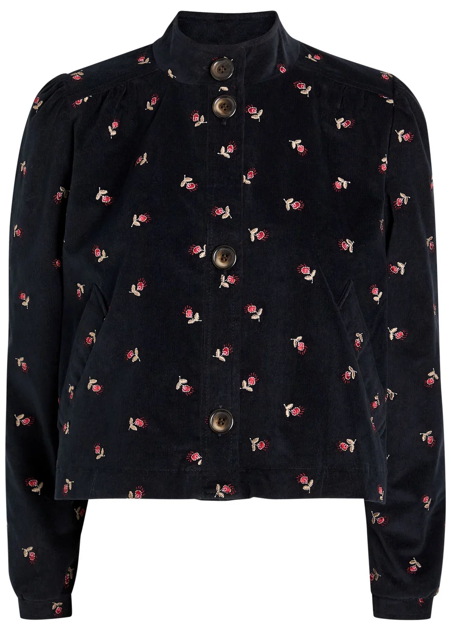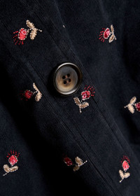 Info & Care Rixo fine cord jacket Floral embroidery, stand collar, puffed shoulders, front slip pockets, pleated details, fully lined Button fastenings through front; 98% cotton, 2% elastane; lining: 100% viscose Dry clean; Coordinating items available Size & Fit Length shoulder to hem: 18 inches/ 46cm Midweight Boxy fit, flared hem Model is 5'9"/ 175cm and wears a size UK8