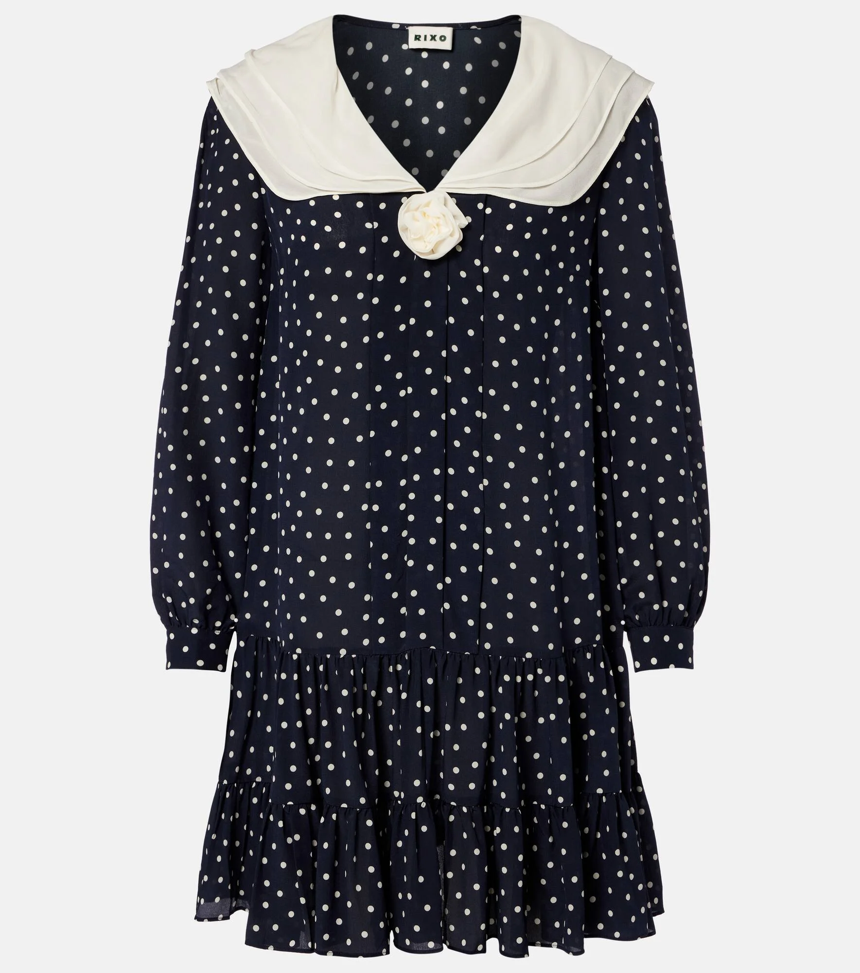 Rixo's designs seamlessly blend retro charm with modern sensibilities. Made from silk crepe, the Valetta minidress features a polka-dot print and a contrasting collar with floral applique. Product Details - Material: 100% silk - Care instructions: dry clean - Made in China - Color: blue - Designer color name: Layla Dot Navy - Material II: 100% viscose - Item number: P01137251 Size & Fit - True to size - Designed for a loose fit - Non-stretchy fabric - The model seen in the picture is 178cm-5'10" and wearing a size XS