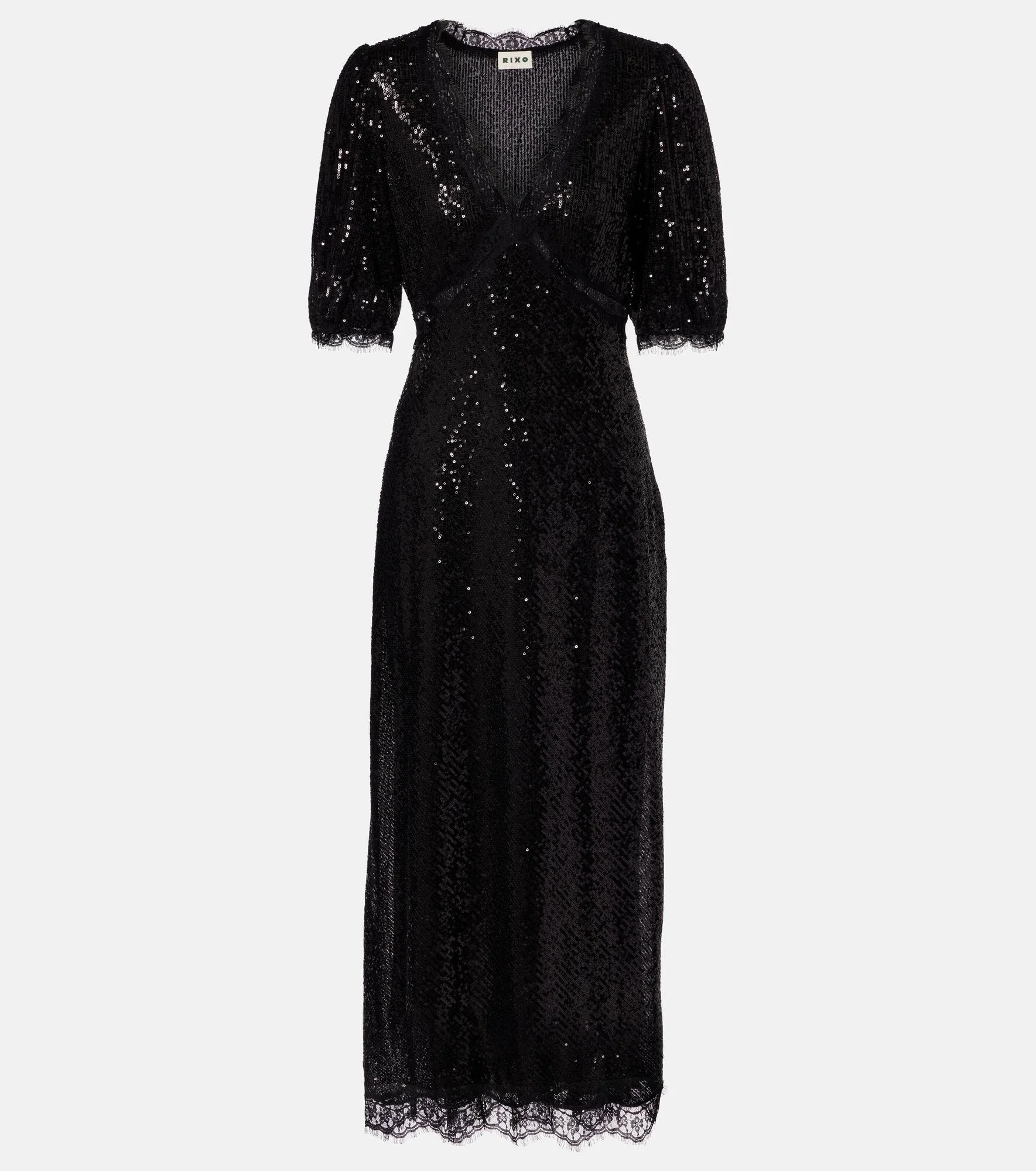 Forget the endless search for hidden gems, Rixo's vintage-inspired dresses deliver ample retro charm. The Verena maxi dress is adorned with shimmering sequins, while delicate lace accents the V-neckline and hem. Product Details - Material: 95% polyester, 5% elastane - Care instructions: dry clean - Made in China - Designer color name: Embellishment Black - Item color: black - Lining: 100% polyester - Collar: V-neck - Closure: zipped side - Fully lined - Item number: P01104151 Size & Fit - Fits large to size - we recommend trying one size smaller - Cinched waist - Non-stretchy fabric - The model seen in the picture is 178cm-5'10" and wearing a size XXS