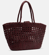 Rixo collaborates with leather specialist Dragon Diffusion to bring you the Lucine tote bag. The design is expertly, intricately woven with structured top handles and a magnetic flap closure. Product Details - Material: leather - Lining: leather - Made in India - Color: burgundy - Designer color name: Bordeaux - Closure: magnetic fastening - Top handles - Item number: P01135594 Size & Fit - Height 25,5cm-10" - Min. width 31cm-12" - Max. width 52cm-20.5" - Depth 7cm-3" - Length shoulder strap 52cm-20.5"