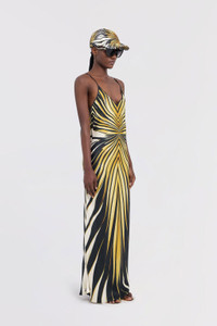 ID: TKT102-4QM33-01080 Radiate magnetic elegance with this pure silk maxi dress, adorned with the vibrant Ray of Gold print. The design features a deep V-neckline and slender spaghetti straps that criss-cross over the open back, creating a sensual and flowing silhouette. Bright yellow and black hues draw bold graphic patterns, capturing the essence of contemporary Roberto Cavalli luxury. Details - Ray of Gold print maxi dress - Crafted from luxurious pure silk for a premium feel - Deep V-neckline at the front - Thin spaghetti straps - Open back design with criss-cross straps - Long, flowing silhouette - Perfect for elegant evenings or exclusive summer events - Pair with high-heeled sandals and minimalist jewellery to complete the look - Made in Italy Care & maintenance External fabric:100% Silk