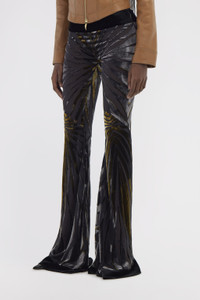 ID: RWT207-VLI15-01080 The Ray of Gold trousers capture the essence of nocturnal glamour with their graphic pattern that radiates elegance. Crafted from luxurious devore velvet, they feature a flared silhouette that elongates the figure, creating fluid and captivating movement with every step. A bold and sophisticated piece, destined to make a statement. The model is 178 cm tall and wears size S / 40 IT. Details - High-waisted design with a flared leg - Crafted from a precious viscose and silk blend with a devore effect - Contrasting velvet waistband and hem trim - Concealed side zip closure - Ideal for exclusive evenings or glamorous events - Pair with a minimalist top and high heels to enhance the silhouette - Made in Italy Care & maintenance External fabric:75% Viscose / Rayon, 25% Silk / Secondary fabric:80% Viscose / Rayon, 20% Silk / Lining:100% Polyester