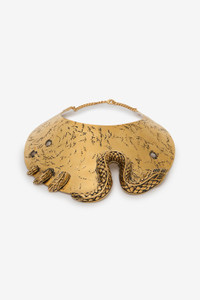 ID: WWG003-AM001-00139 Roberto Cavalli pays homage to the jewelry of ancient civilizations with this bold choker-style necklace, defined by a thick silhouette and a hammered, irregular design with an antiqued gold-tone finish. A tone-on-tone serpent with engraved detailing seems to slither sinuously across the piece, tracing its contours for a daring animal-inspired touch that reflects the Maison’s signature codes. Details - Choker necklace with antiqued gold finish - Irregular hammered texture - Engraved metal snake detail - Back lobster-clasp closure