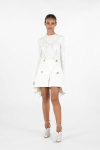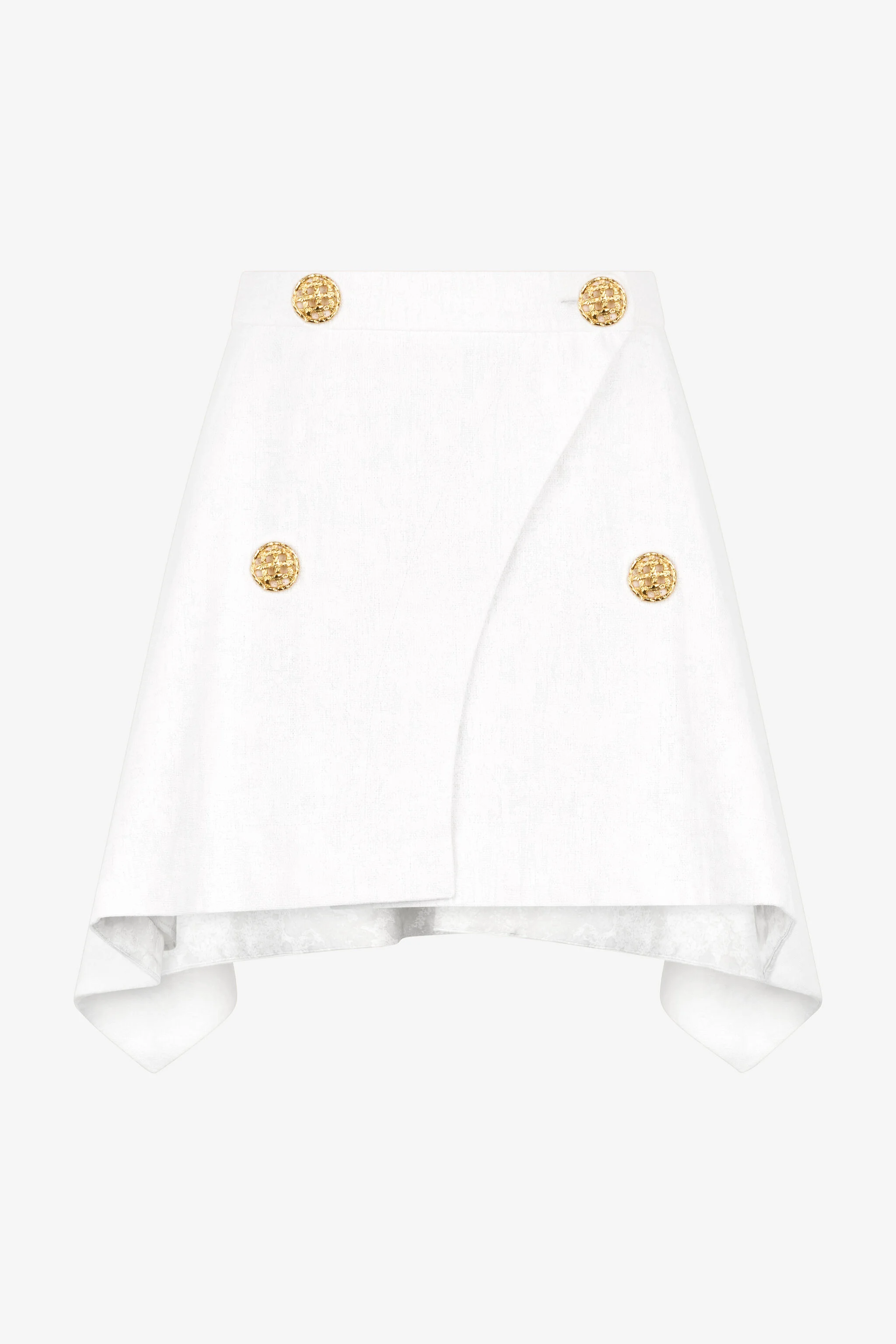 ID: UWT300-LG011-00064 A masterpiece of modern design, this skirt redefines contemporary elegance. The innovative asymmetrical cut creates a dynamic, sculptural silhouette, while the unique texture evokes the 'Wall' print's namesake. Four striking gold-tone buttons provide a touch of iconic Roberto Cavalli opulence, creating a bold contrast against the pristine white fabric. This piece is a statement of confident femininity, designed for the woman who commands attention with sophisticated flair. The model is 178 cm tall and wears size S / 40 IT. Details - Asymmetrical wrap mini skirt - Decorative gold-tone metal buttons with an intricate design - High-waisted silhouette - Asymmetrical pointed hem - Concealed side zip closure - Perfect for elegant cocktails, exclusive parties, or evening events - Pair with a silk blouse and high-heeled sandals for a sophisticated and impactful look - Made in Italy