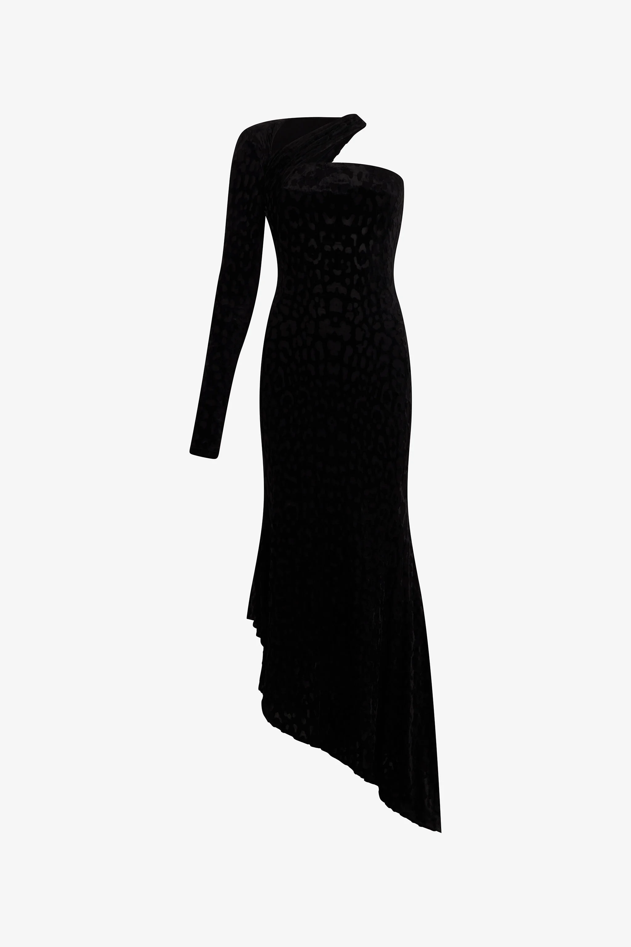 ID: VWT125-CJ003-05051 The animal kingdom is once again a source of inspiration for Roberto Cavalli, expressed in this elegant velvet dress through a Jaguar Skin pattern with a devore effect. The garment features a refined one-shoulder design with a geometric cut-out neckline and is completed by an asymmetrical skirt which is fitted to the knee and fluid at the hem. Details - Long velvet devore-effect dress - All-over Jaguar Skin pattern - One-shoulder design - Geometric neckline with cut-out - Long sleeves - Asymmetrical skirt with looser fit at the hem