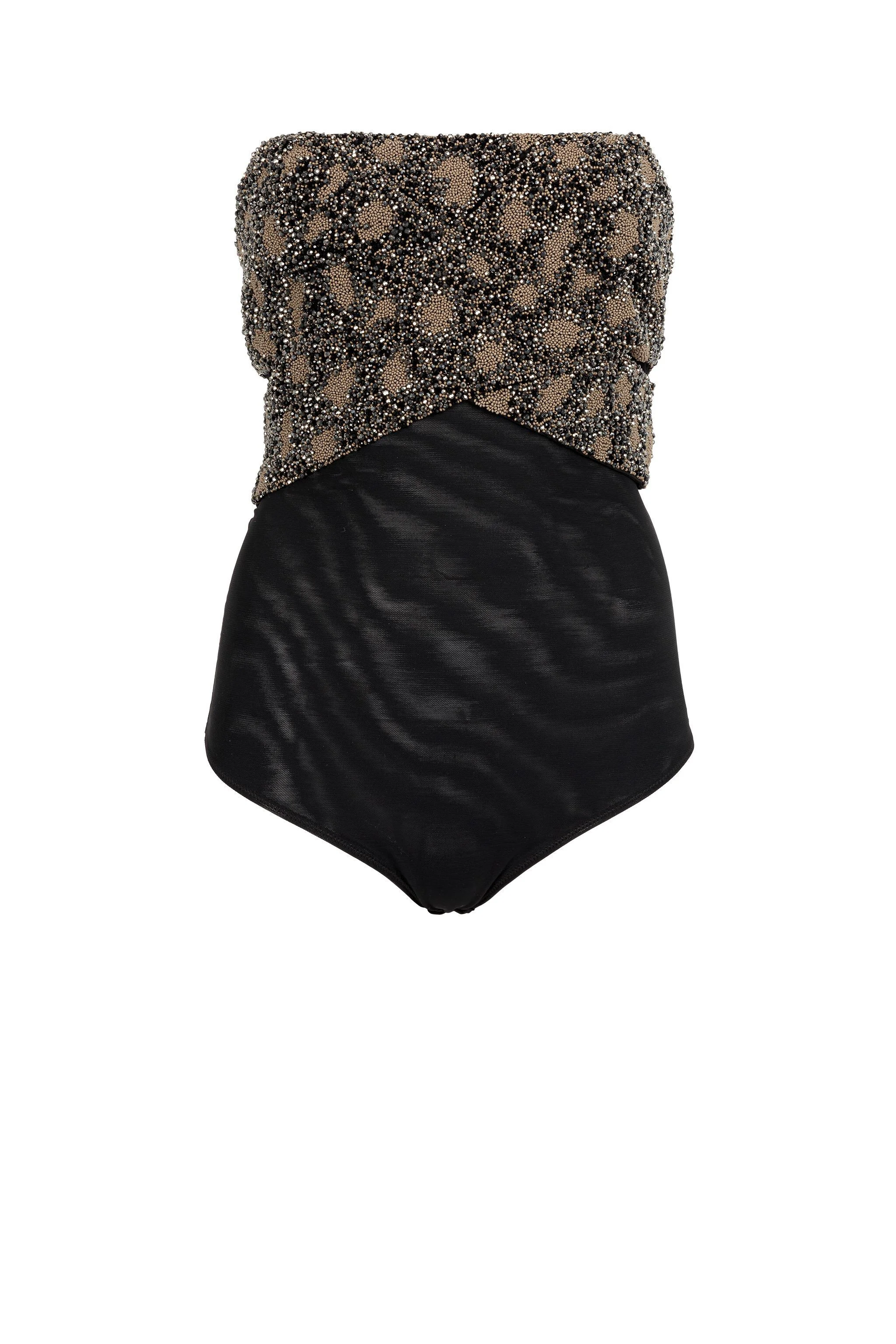 ID: GWR629-RT026-D0072 Bead-Embellished Wrap-Effect Bodysuit Details - Tiger-jacquard body - Sleeveless - Concealed zip side fastening - Bodycon fit Care & maintenance External fabric:50% Polyamide, 38% Silk, 12% Elastane / Lining:100% Silk / Embroidery - Decoration:100% Glass fibre