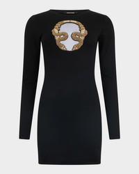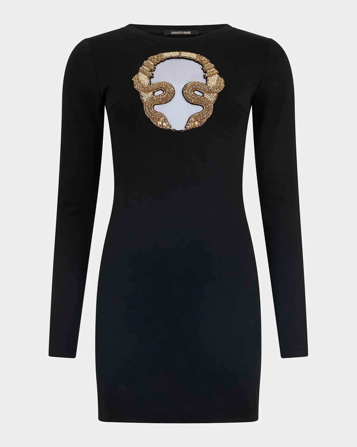 Roberto Cavalli dress is crafted from matte jersey featuring a sheer chest cutout adorned with beaded snakes High neckline Long sleeves Bodyconscious silhouette Mini length Slipover style Viscose/paper/elastane Made in Italy