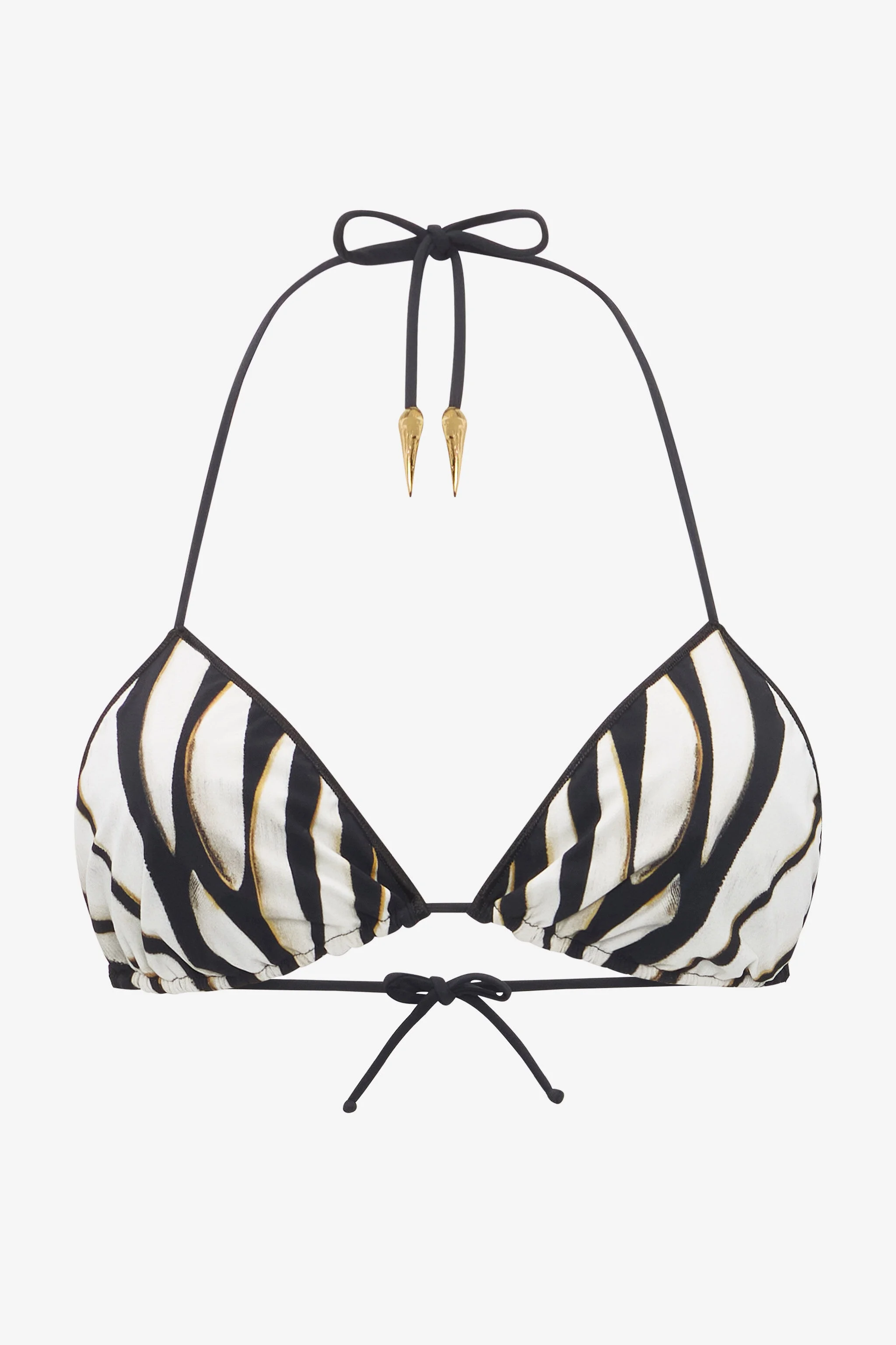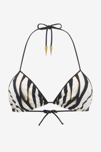 ID: TKW012-HVM33-01080 Immerse yourself in radiance with the Ray of Gold bikini top. This triangle style, featuring a vibrant print inspired by sun rays overlaid on an animal pattern, captures the essence of summer glamour. Halter neck and back tie closures, finished with gold-tone details, ensure a perfect fit and add a touch of signature Roberto Cavalli luxury. Details - Triangle bikini top - All-over Ray of Gold print - Adjustable halter neck and back tie fastenings - Gold-tone logo-engraved cord ends - Ideal for beach days or poolside lounging - Pair with the matching bikini bottoms and a light kaftan for a complete resort look - Made in Italy Care & maintenance External fabric:72% Polybutylene terephthalate, 28% Elastane / Lining:84% Polyester, 16% Elastane