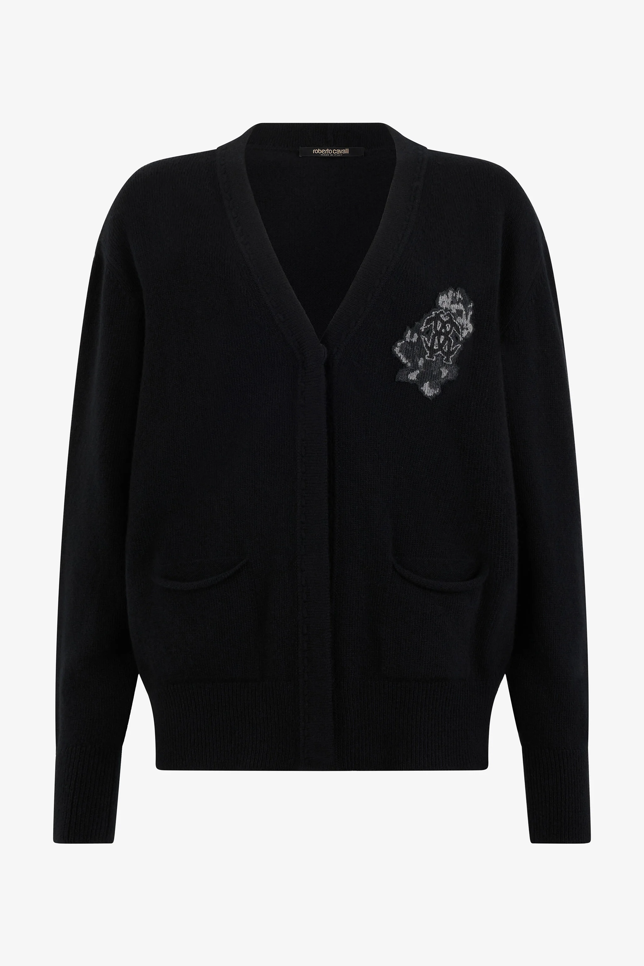 ID: VKM908-MQ013-05051 Embrace effortless elegance with this cardigan by Roberto Cavalli, crafted from a soft blend of virgin wool and stretch cashmere. The design features two convenient front pockets with rolled openings and is enhanced by an embroidered patch showcasing the distinctive Monogram Mirror Snake accompanied by a floral motif prominently displayed on the chest. Details - Cardigan in stretch wool and cashmere blend - Long sleeves with dropped shoulders - V-neck - Embroidered patch with Monogram Mirror Snake on the chest - Two front pockets with rolled top opening - Ribbed neckline, cuffs, and hem - Concealed front closure - Roberto Cavalli label inside the collar - Made in Italy