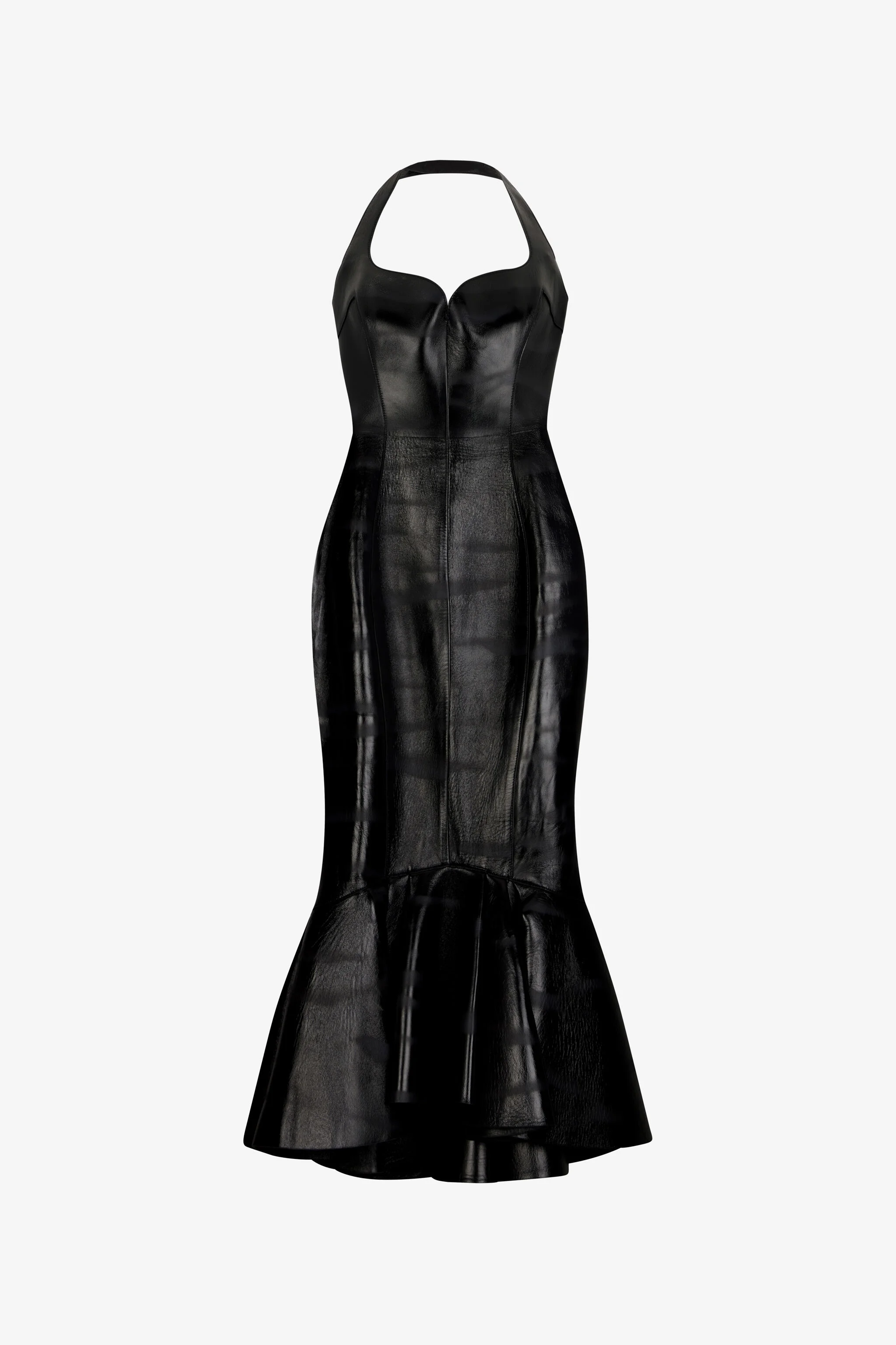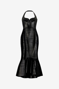 ID: VWP108-PN001-05051 This midi dress by Roberto Cavalli combines elegance and sensuality with a bare-shoulder design with a halterneck. This style, made of genuine leather, is enhanced by a romantic touch provided by the bodice with a sweetheart neckline and a voluminous high flounce with ruffles on the hem. Details - Glossy-effect leather dress - Sheath dress with flounce hem - Halterneck - Bodice with sweetheart neckline - Ankle-length - Back zipper fastening and exposed pull-tab Care & maintenance Leather - Fur:Ovis Aries Aries / Lining:100% Viscose / Rayon