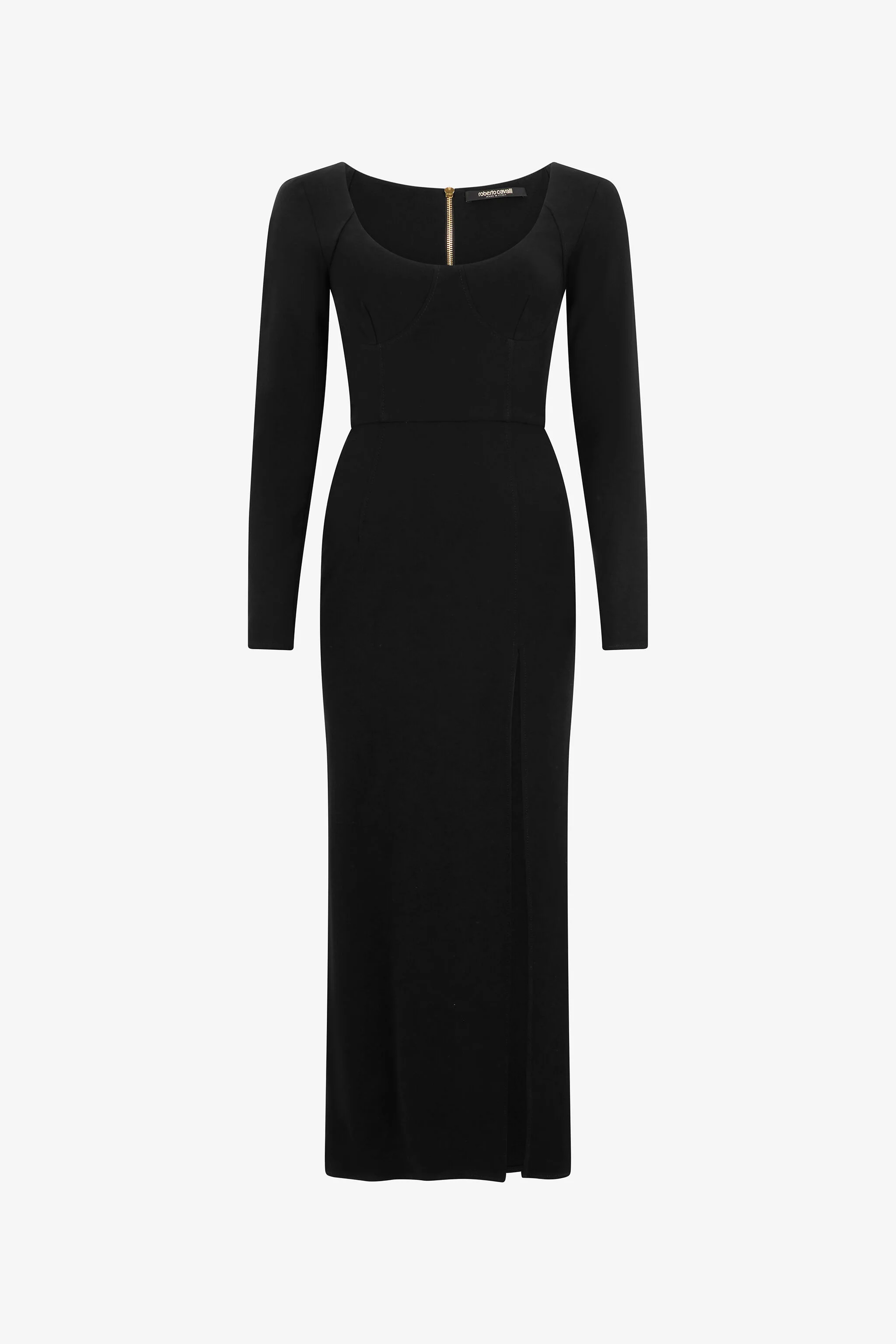 ID: VWT163-WP010-05051 Elegance and sensuality blend harmoniously in this midi dress with an essential cut, made of a wool blend and featuring a wide round neckline with molded cups and a deep side slit. The metal zipper on the back features a pull-tab finished with the Mirror Snake Monogram, the iconic symbol of Roberto Cavalli. Details - Midi dress - Rounded neckline - Molded cups - Long sleeves - Side slit - Zipper fastening on back - Roberto Cavalli label on the inside collar - Made in Italy