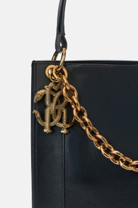 ID: VKB005-PNE02-05051 Prepare to elevate your style with this shopper bag by Roberto Cavalli, distinguished by its masterful play of contrasts. The design combines the simplicity of vertical lines with a striking visual detail: a large gold chain with thick links cascading across the front, further enhanced by a charm featuring the iconic Monogram Mirror Snake. Details - Shopper bag model - Maxi golden chain with Monogram Mirror Snake charm - Top handle for shoulder carrying - Top opening