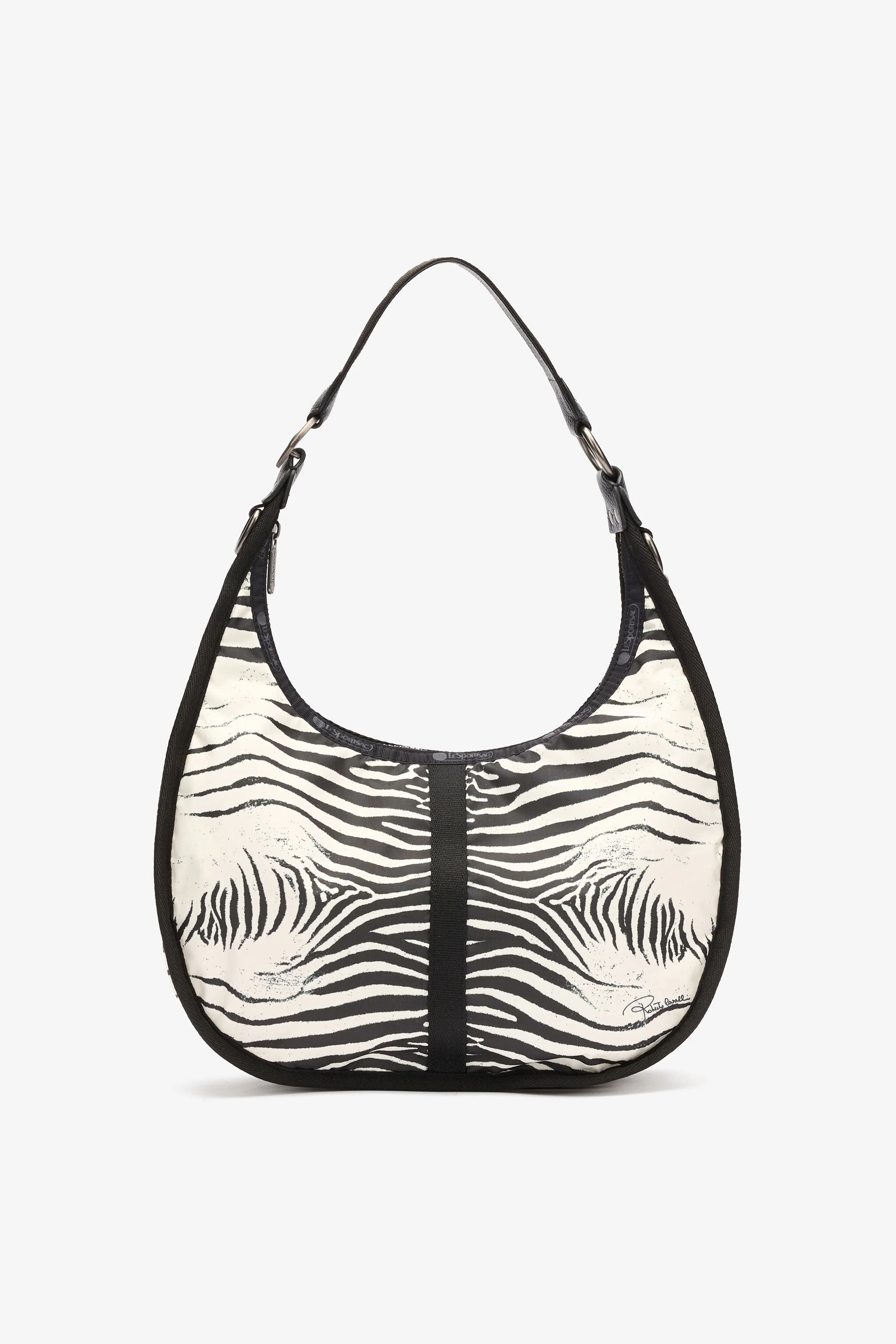 ID: ULL004-IL004-E0471 A sleek Mini Zebra Bologna Medium with a ruched design and silver hardware, perfect for day or night. The detachable crossbody strap provides multiple ways to wear it with ease. Purchase this stylish bag today for a functional and fashionable upgrade. Details - A collaboration between Roberto Cavalli and LeSportSac - 8.5H x 13W x 4.25D in, 21.6H x 33W x 10.8D cm Care & maintenance External fabric:100% Polyester / Secondary fabric:100% Polyurethane / Lining:100% Polyester