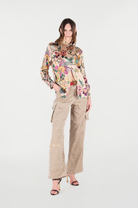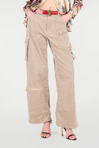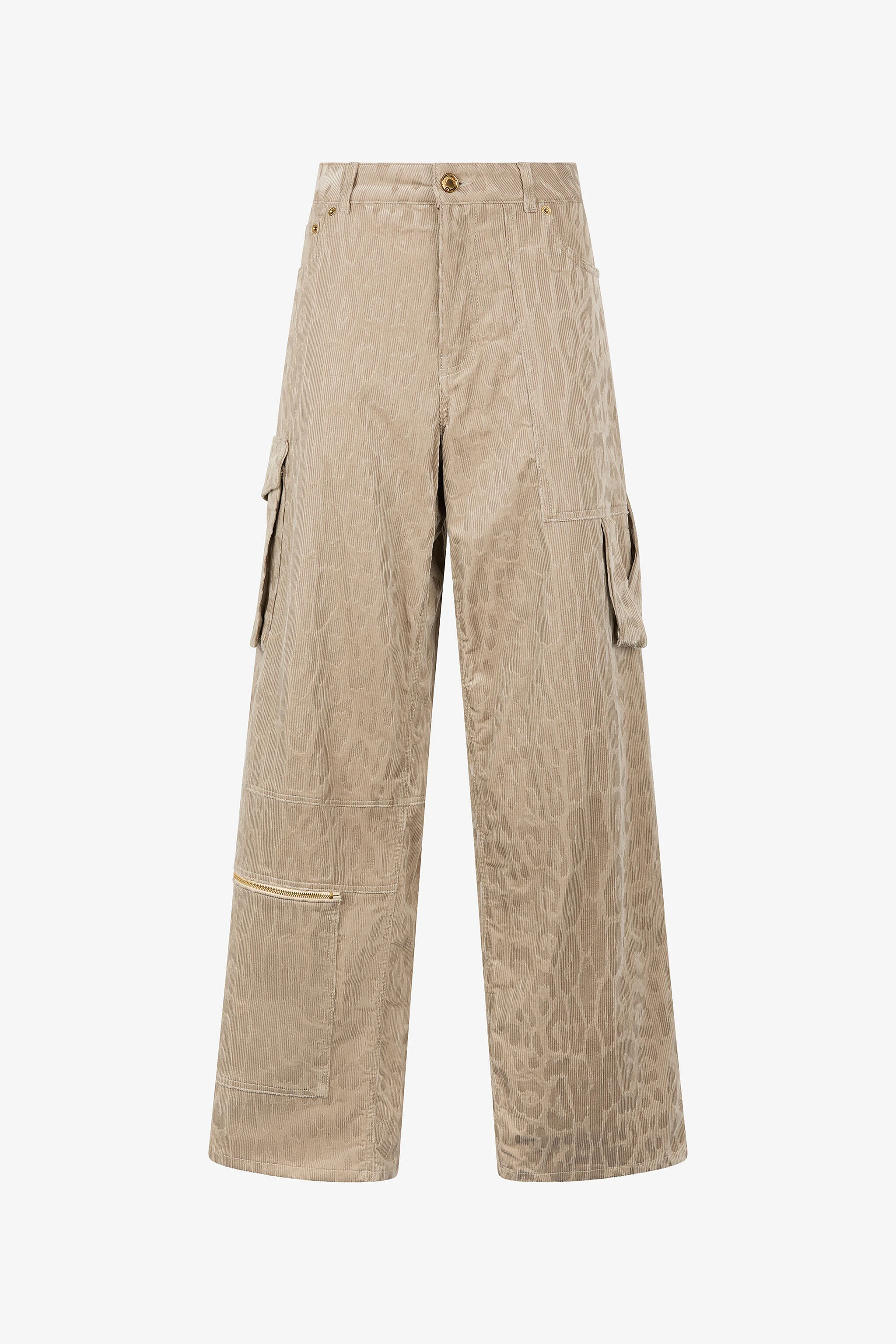 ID: VKT250-VL076-00551 The feline spirit of these Roberto Cavalli pants will add a touch of wild elegance to your everyday looks. The garment, featuring a five-pocket design and a wide leg, is made of soft stretch cotton velvet and is animated by a refined ribbed workmanship that reveals the iconic Jaguar Skin pattern on the entire surface. A perfect blend of functionality and sophistication, this model features large side gusset pockets and a practical zip pocket at the leg hem, and is completed by convenient belt loops and the signature golden button with the iconic snake. Details - Stretch cotton velvet cargo pants - Rib knit - All-over Jaguar Skin pattern - Gusset side pockets - Large pocket with zipper at the leg hem - Branded tag on back - Five-pocket design with branded metal rivets