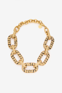 ID: VKG022-AM011-D3879 A cascade of sparkling set crystals, interrupted only by the streaks of the Tiger Skin pattern, enlivens the thick links of this round necklace with a chain design and gold finish, perfect for adding a touch of timeless luxury to special occasion looks. Details - Chain choker necklace with thick links - All-over crystals with contrasting Tiger Skin pattern - Medallion with Roberto Cavalli logo - Adjustable fastening with clasp - Made in Italy
