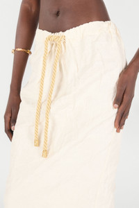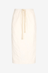 ID: UWT303-FN026-09088 This midi skirt embodies a relaxed elegance, perfect for those seeking a versatile and sophisticated garment. The drawstring detail adds a touch of casual chic, making it ideal for various occasions. The model is 178 cm tall and wears size S / 40. Details - Elegant and timeless midi design - Drawstring waist for an adjustable fit - Back slit for ease of movement - Made in: Italy - Perfect for creating casual daytime looks or more sophisticated evening outfits - Pair with a light blouse and heels or with a t-shirt and sneakers for a more relaxed look Care & maintenance External fabric:73% Cotton, 27% Polyester