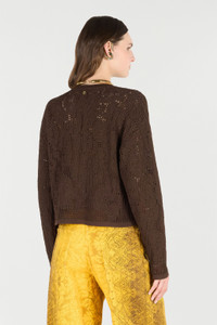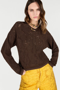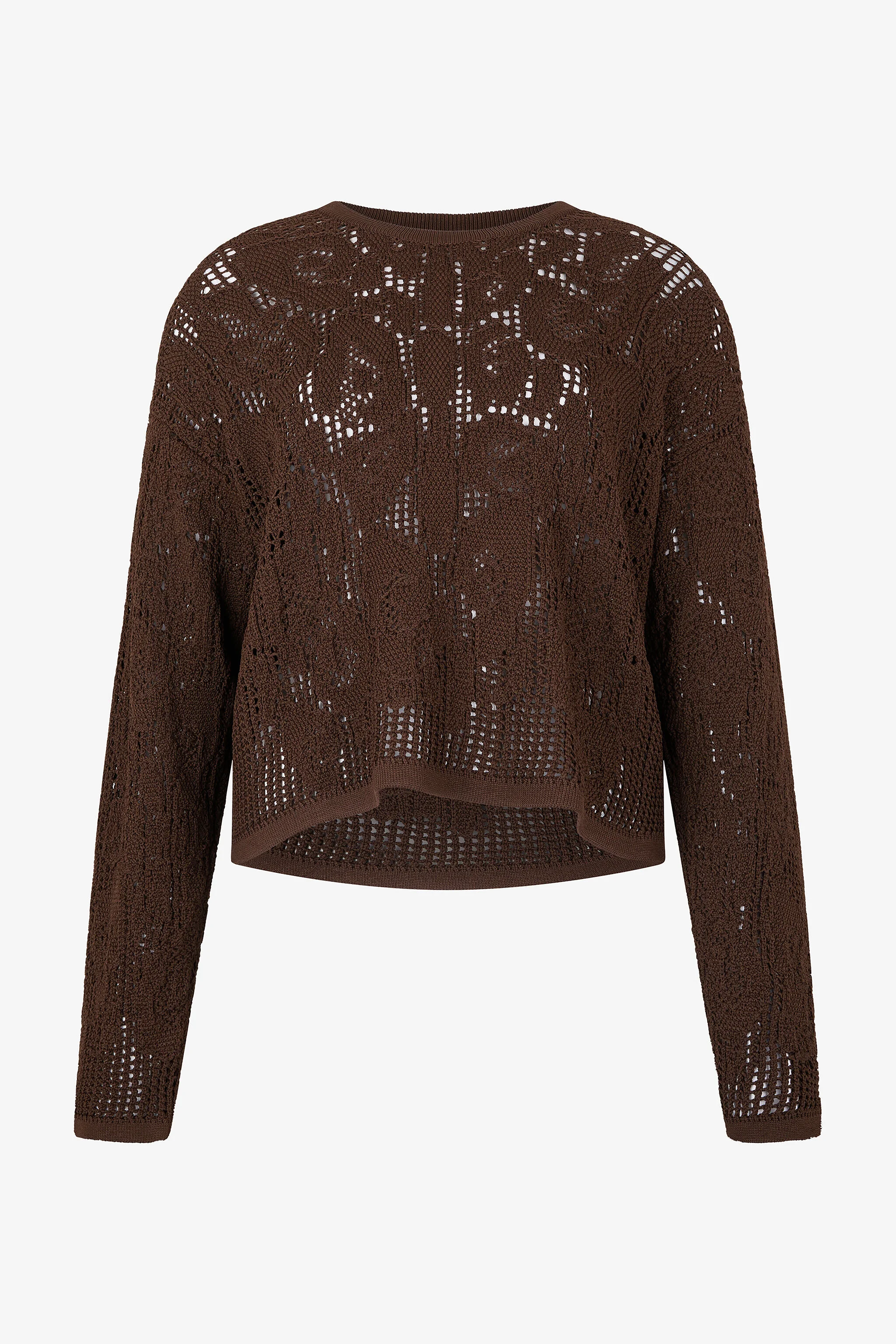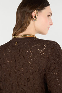 ID: VKM616-MAC01-01660 Add an effortlessly elegant piece to your wardrobe with this refined Roberto Cavalli sweater featuring a micro-openwork crochet that creates a sensual see-through effect. The iconic Mirror Snake Monogram in the form of a golden charm stands out on the back to embellish the design. Details - Sweater with a crochet effect - Micro-openwork texture - Crew-neck - Long sleeves with dropped shoulders - Small metal Mirror Snake Monogram at the back of the neck