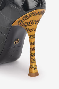 ID: VKS220-PZ579-05051 These elegant pumps with a pointed design feature a shiny-effect upper with the iconic crocodile scale-effect embossing, Roberto Cavalli’s unmistakable signature. The towering spool heel, featuring a golden finish and an animal-inspired motif, slims the figure and adds even more boldness to the model. Details - Pointed-toe pumps - Crocodile scale-effect shiny upper - High heel with gold spool and animal inspired motif - Roberto Cavalli label on the insoles - Metallic RC monogram under the sole - Made in Italy