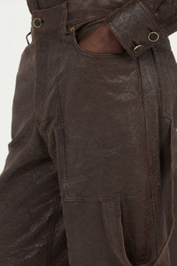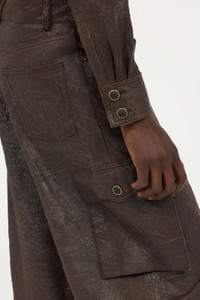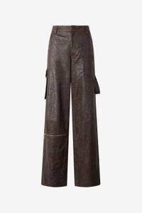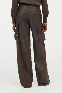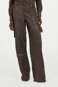 ID: VWP250-PN002-03503 Roberto Cavalli reinterprets utility style with these wrinkled-effect genuine leather cargo pants, perfect for adding a bold touch to everyday wardrobes. The model features practical details, such as the utility pocket and the maxi loop down the leg and, in addition to the convenient belt loops, is complete with an exposed zip pocket at the hem. Details - Genuine leather cargo pants - All-over wrinkled effect - Wide leg - Maxi loop down the leg - Two large functional front pockets - Two back patch pockets - Side utility pocket with buttoned flap - Zipped pocket on hem - Front fastening with golden button Care & maintenance Leather - Fur:Ovis Aries Aries / Lining:100% Viscose / Rayon / Secondary lining:100% Cotton