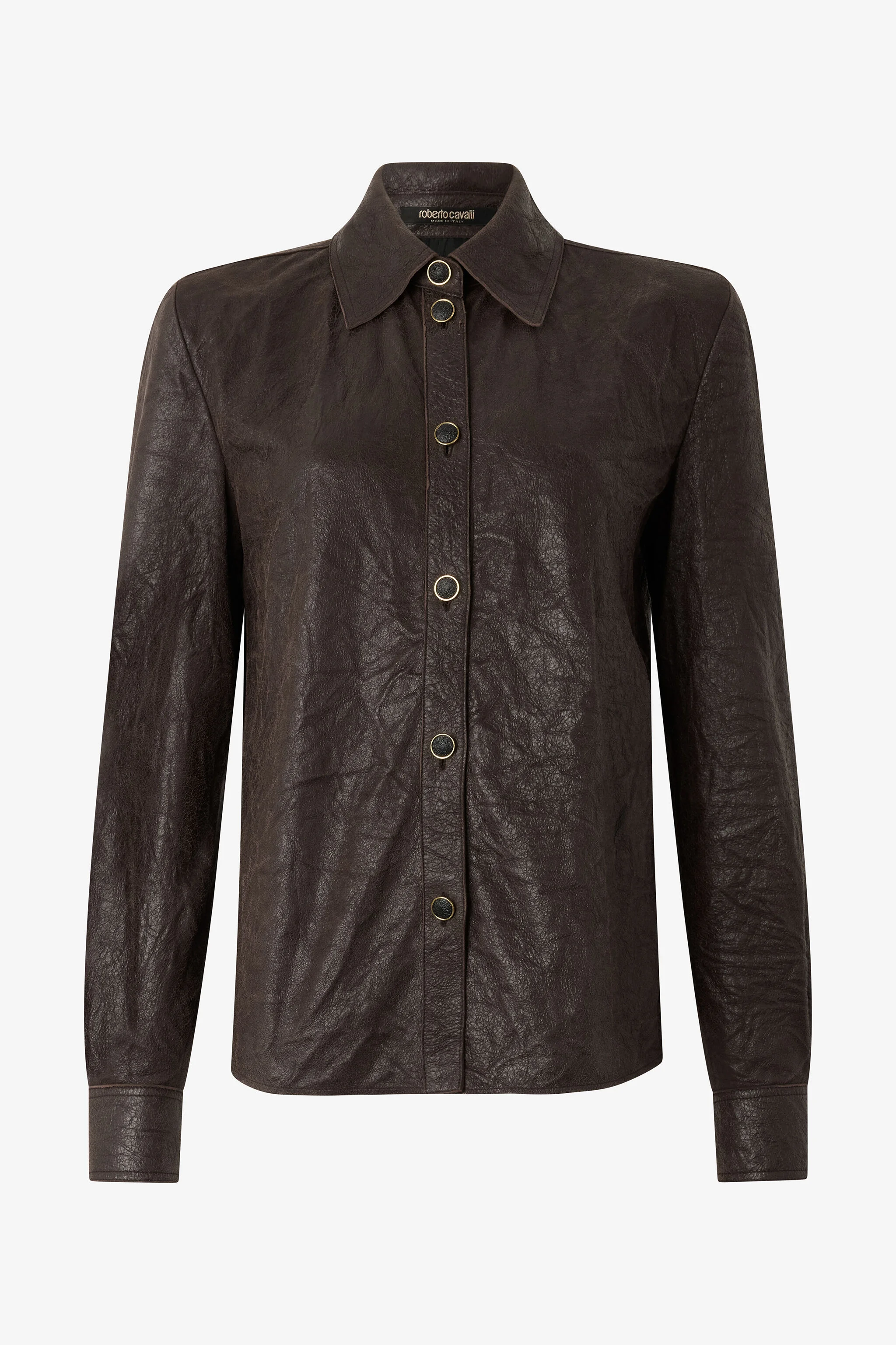 ID: VWP700-PN002-03503 Roberto Cavalli revamps the refined genuine leather shirt with a clean, essential design, yet it doesn’t forgo the Maison’s signature touch of extravagance, expressed through an all-over wrinkled texture. This style, made entirely in Italy, features a long-sleeved design with a classic collar and is complete with a front fastening with exposed buttons. Details - Genuine leather shirt - Wrinkled effect - Classic collar - Long sleeves - Cuffs with double button - Yoke with box pleat on the back - Front fastening with buttons - Roberto Cavalli label on the inside collar - Made in Italy Care & maintenance Leather - Fur:Ovis Aries Aries / Lining:100% Viscose / Rayon