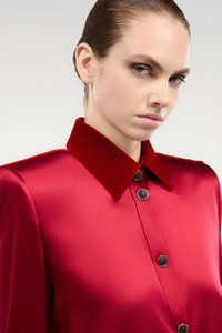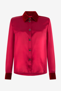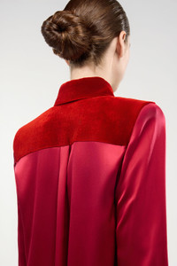 ID: VWT700-SE041-02065 An expression of an elegant style that is never predictable, this pure silk shirt with a minimalist design features a collar, back panel and cuffs in soft tone-on-tone velvet. The model is finished with engraved buttons and gold-tone trims. Details - Pure silk shirt - Velvet collar, back insert and cuffs - Long sleeves - Cuffs with button - Yoke with box pleat on the back - Front fastening with buttons Care & maintenance External fabric:100% Silk / Secondary fabric:82% Viscose / Rayon, 18% Silk