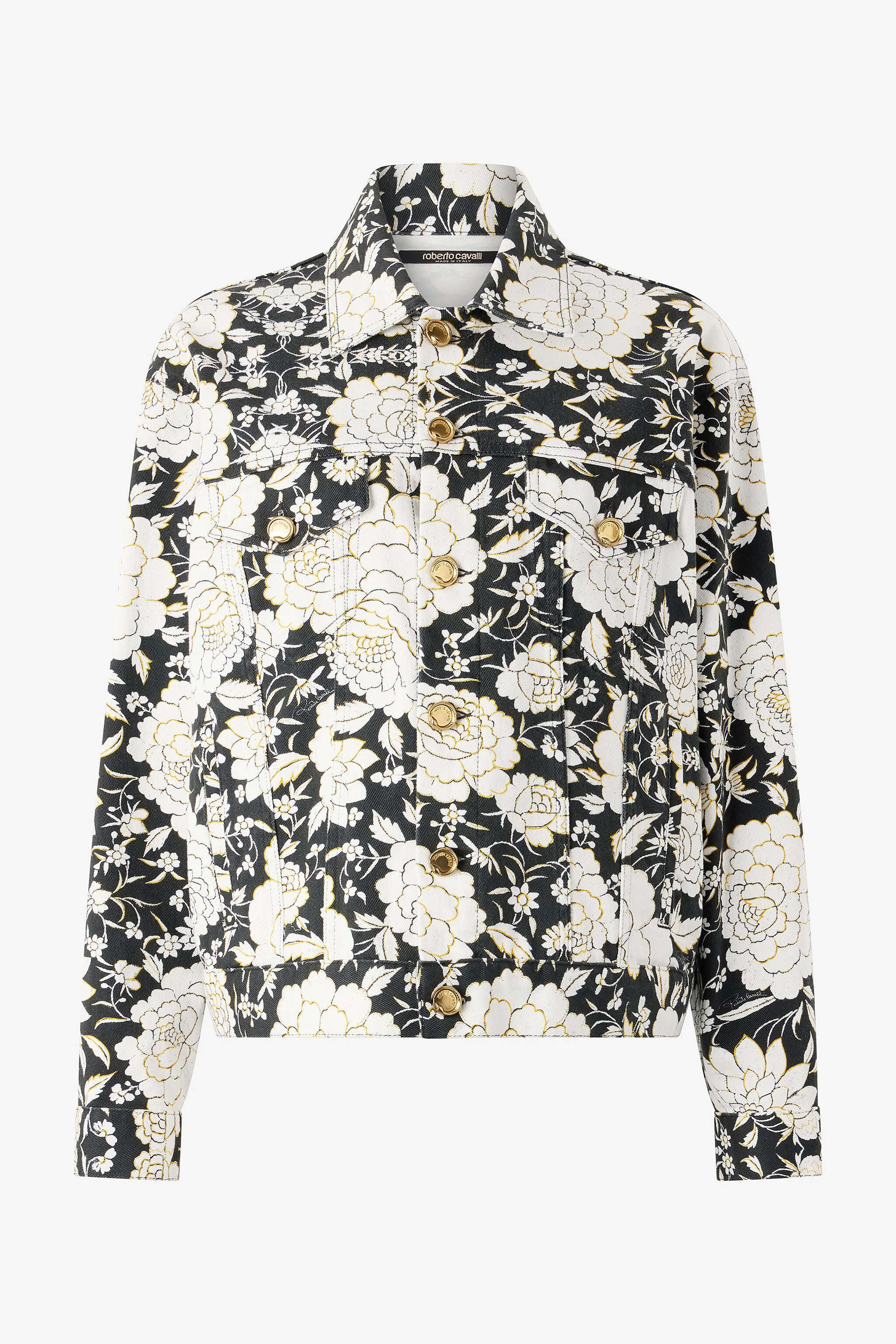 ID: VQJ420-DAP71-D0477 An expression of casual and contemporary luxury, this stretch cotton denim jacket by Roberto Cavalli is animated by a refined all-over contrasting floral pattern. The garment is completed with two breast pockets with flap and button, two convenient side pockets and a front fastening with buttons. Details - Stretch cotton denim jacket - Long sleeves - Branded button on cuffs - All-over flower print - Pointed collar - Two flap breast pockets with branded button - Two side pockets - Front branded button fastening - Roberto Cavalli label on the inside collar - Made in Italy