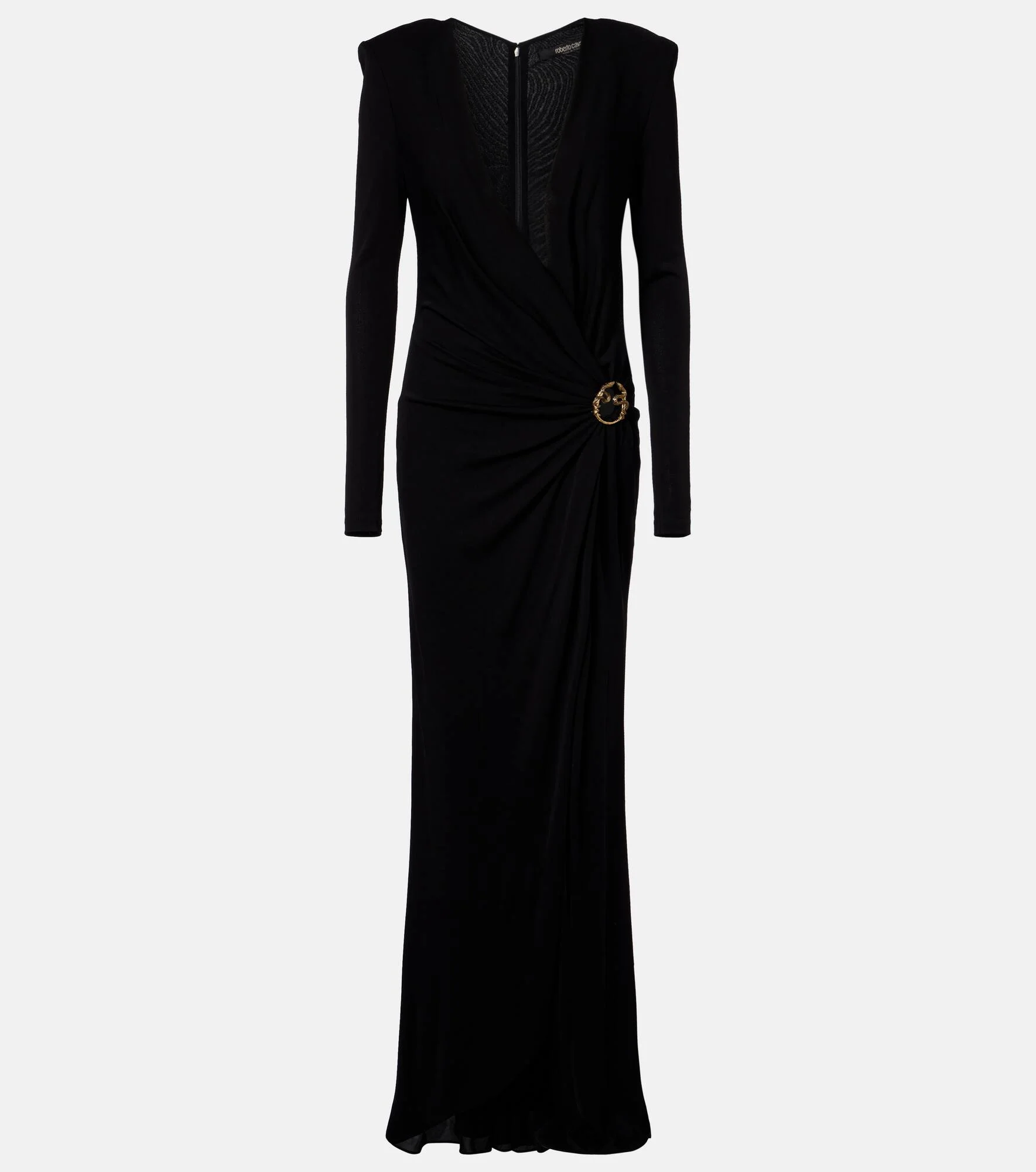 Sophisticated and unapologetically daring, Roberto Cavalli's designs make any event an unforgettable one. This long-sleeve gown features soft draping, a gold-tone adornment, and a plunging neckline. Product Details - Material: 80% acetate, 20% polyamide - Care instructions: dry clean - Made in Italy - Color: black - Designer color name: Black - Closure: concealed zipped back - Item number: P01132832 Size & Fit - Fits large to size - we recommend trying one size smaller - Shoulder pad inserts - Cinched waist - Stretchy fabric - The model seen in the picture is 178cm-5'10" and wearing a size IT 38