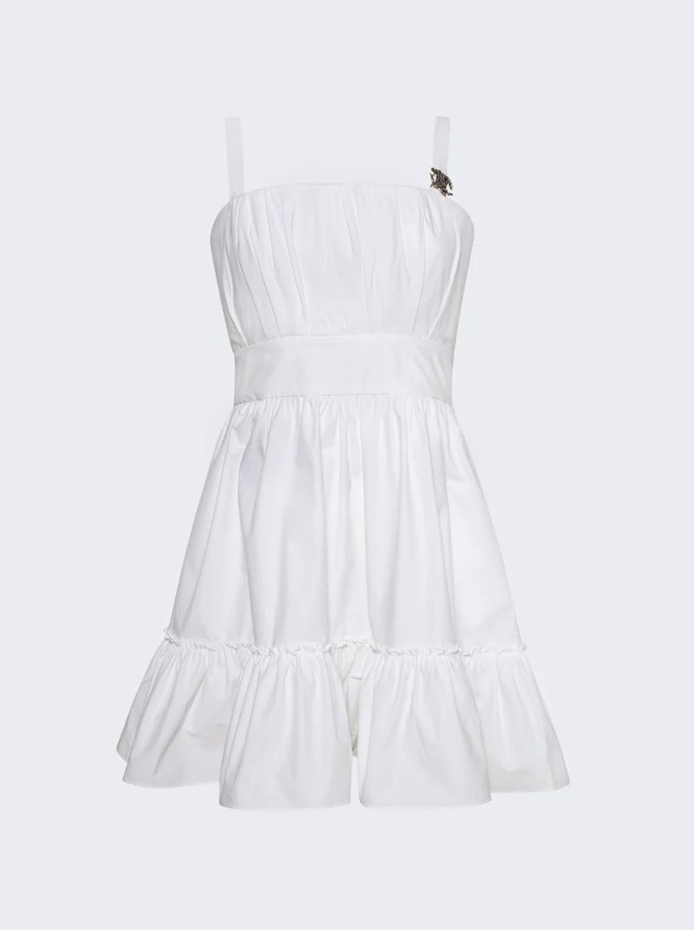 Details - Regular fit - Shoulder straps - Pleated design - Waistband - Skirt with flounce - Metallic Mirror Snake Monogram on one shoulder strap - Rear zip closure - Care according to label - Material: 100% Cotton - Model is 5'9"/175cm and is wearing a size IT40 Brand Style: VKT106 CH033 00053 Designer/Brand: ROBERTO CAVALLI