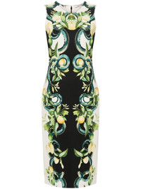 lemon-print crepe midi dress Highlights - Black/green - Crepe texture - All-over lemon and snake print - Round neck - Wide shoulder straps - Concealed rear hook and zip fastening - Pencil silhouette - Straight hem - Central rear vent - Mid-length Made in Italy Composition Viscose 95%, Spandex/Elastane 5% SIZE & FIT Model measurements Height 5 ft 10 in(1.78 m) Bust/Chest 33.46 in(85 cm) Hips 36.22 in(92 cm) Waist 23.22 in(59 cm) FittingInformation Designed for a slim fit that sits just away from the body offering a close yet comfortable fit The vented hem offers movement at the rear Made from a midweight non-stretch fabric This piece fits true to size – take your usual size