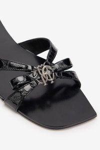 ID: UKS008-PZV97-D0056 These slide-style low sandals feature a minimal and elegant design, embellished with leather straps with elegant crocodile scale-effect embossing that converge in a refined bow, enhanced by the Mirror Snake Monogram, a symbol of the Maison's DNA. The model with a square toe is further refined by the Roberto Cavalli signature on the insole. Details - Slider-style sandals - Square toe design - Crocodile scale-effect embossed straps, bow detail and Mirror Snake Monogram - Leather-lined insole with Roberto Cavalli signature - Leather sole - Low contrasting heel Care & maintenance Lining:100% Capra hircus linneaus / Outer sole:100% Bos Taurus / Upper:100% Bos Taurus