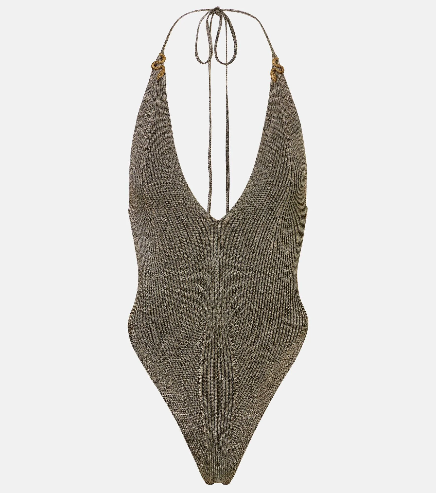 Roberto Cavalli needs no introduction: glamour, boldness, and unmistakable Italian style define every collection. This lame bodysuit is designed with a self-tie halterneck and adorned with signature snake hardware. Product Details - Material: 90% viscose, 9% metallic fibres, 1% polyester - Care instructions: dry clean - Made in Italy - Color: gold - Designer color name: Gold/Black - Self-tie neck - Closure: hook fastening - Hardware color: gold - Item number: P01159244 Size & Fit - True to size - Low back - Fitted - Stretchy fabric - High-cut leg - The model seen in the picture is 178cm-5'10" and wearing a size XS