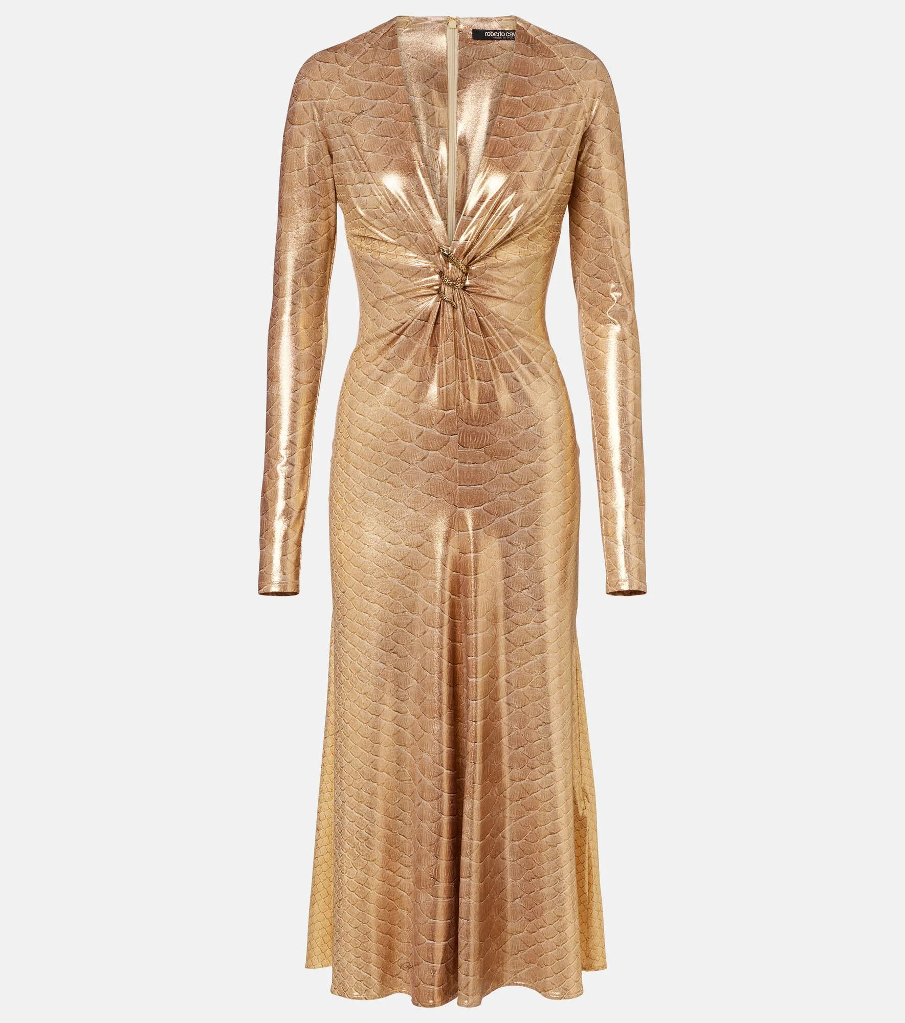 Exude elegance in this midi dress from Roberto Cavalli. The flowing design features a V-neckline, all-over snake print, and dazzling metal embellishments. Product Details - Material: 86% polyamide, 14% elastane - Care instructions: dry clean - Made in Italy - Color: gold - Designer color name: Bege/Gold - Details: 100% metal - Closure: concealed zipped back - Item number: P01159249 Size & Fit - True to size - Cinched waist - Slightly stretchy fabric - The model seen in the picture is 178cm-5'10" and wearing a size IT 40