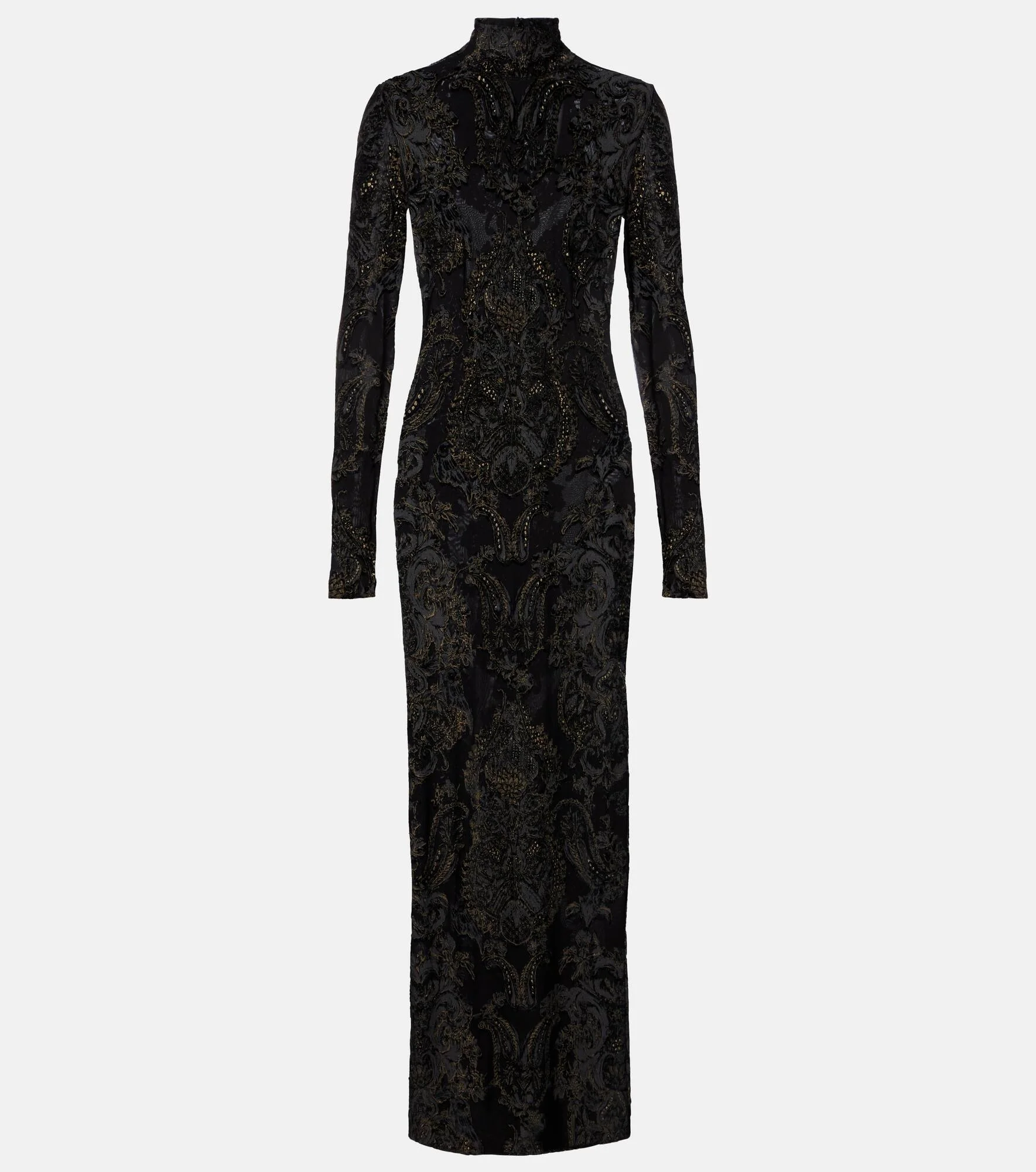 Nobody captures the spirit of Italian elegance quite like Roberto Cavalli. This bold gown features a figure-skimming silhouette crafted from soft mesh and is finished with tonal velvet appliques embroidered with touches of gold. Product Details - Material: 55% viscose, 40% polyester, 5% elastane - Care instructions: dry clean - Made in Italy - Color: black - Designer color name: Black - Collar: mockneck - Closure: concealed zipped back - Item number: P01132842 Size & Fit - True to size - Fitted - Stretchy fabric - slit length 61cm-24" - The model seen in the picture is 178cm-5'10" and wearing a size IT 40