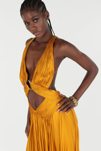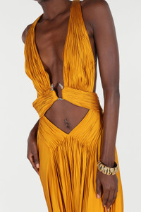 ID: VKT158-CC001-01127 This extra-long pure silk dress sports a refined fluid design animated by a pleated texture on the decolletage and skirt, and features an intriguing cut-out at the waist and straps that cross at the rear, leaving the back bare. This Roberto Cavalli design also stands out for its vibrant monochromatic hue and a deep V-neckline that ends with a metallic detail featuring the tiger Fang, a meeting point of two bands converging at the front to create a refined ruched effect. Details - Extra-long pure silk dress - Plunging V-neckline and cut-out at the waist - Loose fit and open-back design - Metallic detail with tiger Fang - Front fastening with concealed zipper - Label with logo on the inside - Made in Italy