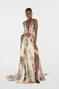 ID: VKT158-CTP76-D1412 This extra-long pure silk dress sports a refined fluid design animated by a pleated texture on the decolletage and skirt, and features an intriguing cut-out at the waist and straps that cross at the rear, leaving the back bare. This Roberto Cavalli design also stands out for its colorful nature-inspired print featuring all-over flowering branches and pheasants, while the deep V-neckline ending with a metallic detail adorned with the tiger Fang serves as the meeting point of two bands that converge at the front, creating a refined ruched effect. Details - Extra-long pure silk dress - All-over flowering branches and pheasant motif - Plunging V-neckline and cut-out at the waist - Metallic detail with tiger Fang - Front fastening with concealed zipper - Label with logo on the inside - Made in Italy
