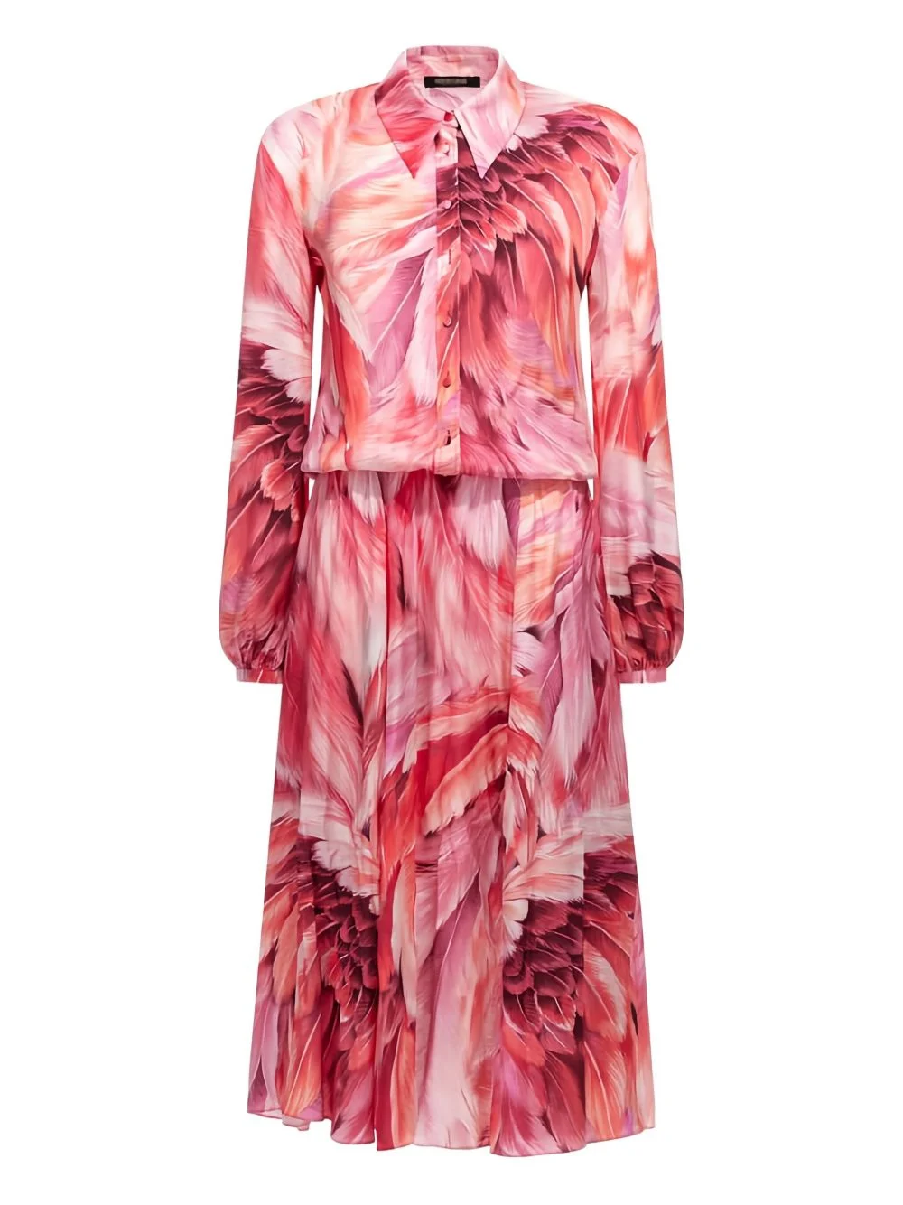 feather-print button-down midi dress Highlights - Pink - Feather print - Button-down fastening - Long sleeves - Cinched waist - A-line skirt Made in Italy Composition Viscose 100% Washing instructions Read Manufacturer Guidelines