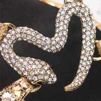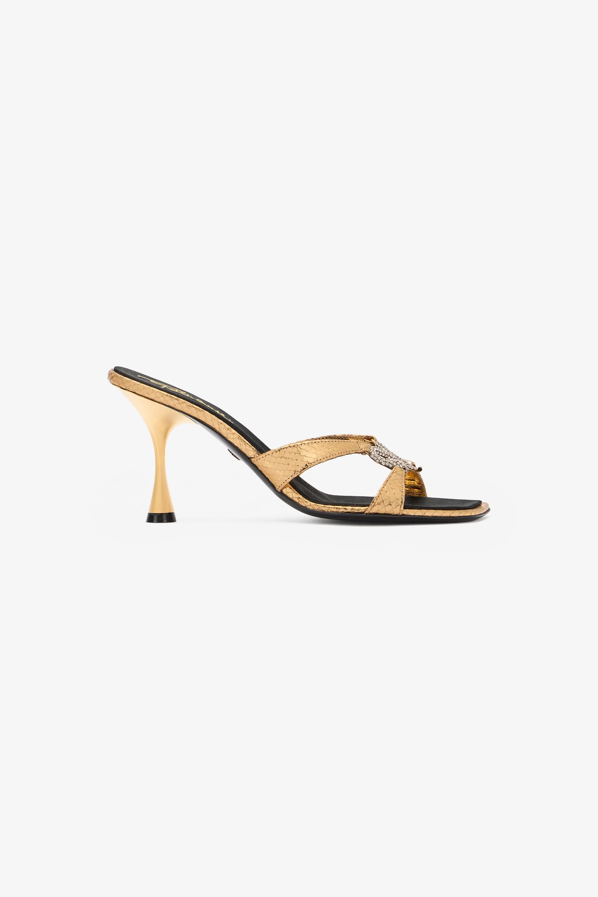 ID: UKS013-PZ579-00047 An opulent snake scale-effect print enriches these mule-style sandals in laminated leather with a sophisticated spool heel by Roberto Cavalli. The model is embellished by the iconic RC Monogram on the sole and two fine straps on the upper that come together in an attractive central detail: a snake studded with crystals, which forms a heart with its sinuous body. Details - Mule-style sandals crafted from laminated leather with a snake scale effect - Leather-blend inner lining - Heart-shaped central snake straps studded with crystals - Leather sole with metallic RC Monogram and Roberto Cavalli logo - Mid-height spool heel - Made in Italy Care & maintenance Lining:100% Capra hircus linneaus / Outer sole:100% Bos Taurus / Upper:100% Bos Taurus