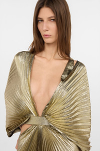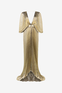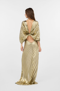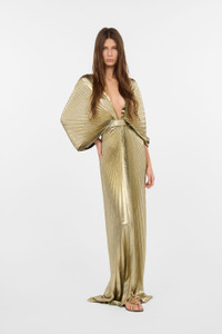 ID: WWT109-GU002-00240 A tribute to the radiant beauty of the sun, the Ray of Gold motif illuminates this ultra-long dress in a soft silk blend, enhanced by a pleated design that brings volume and fluid movement to the silhouette. Feminine details complete the look, from the deep V-neckline at both front and back to the wide three-quarter cape-effect sleeves, the golden band that highlights the waist, and the sensual cut-out at the lower back. Details - Extra-long silk blend dress - Pleated Ray of Gold motif - Deep V neckline at the front and back - Wide cape-style sleeves - Waistband - Back cut-out detail