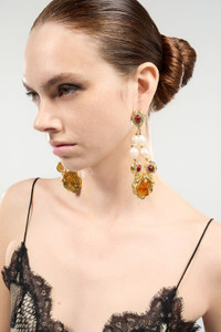 ID: VWG014-AM081-T0203 An ode to elegance and opulence, these earrings made entirely in Italy feature a chandelier design embellished with a refined contrasting effect. Delicately colored pearls are alternated with oval and teardrop stones surrounded by embedded crystals, while a larger pendant with a central stone profiled by a sinuous snake stands out in the center of the piece. The back of the accessory is finished with a lattice design and an oval plaque engraved with the logo, an additional nod to the Maison’s DNA. Details - Chandelier earrings - Pearls alternating with stones framed by embedded crystals - Pendant with snake edging and central stone - Clip-on - Lattice design on the back - Roberto Cavalli logo on the back - Made in Italy Care & maintenance Composition:Glass, Perla, Brass